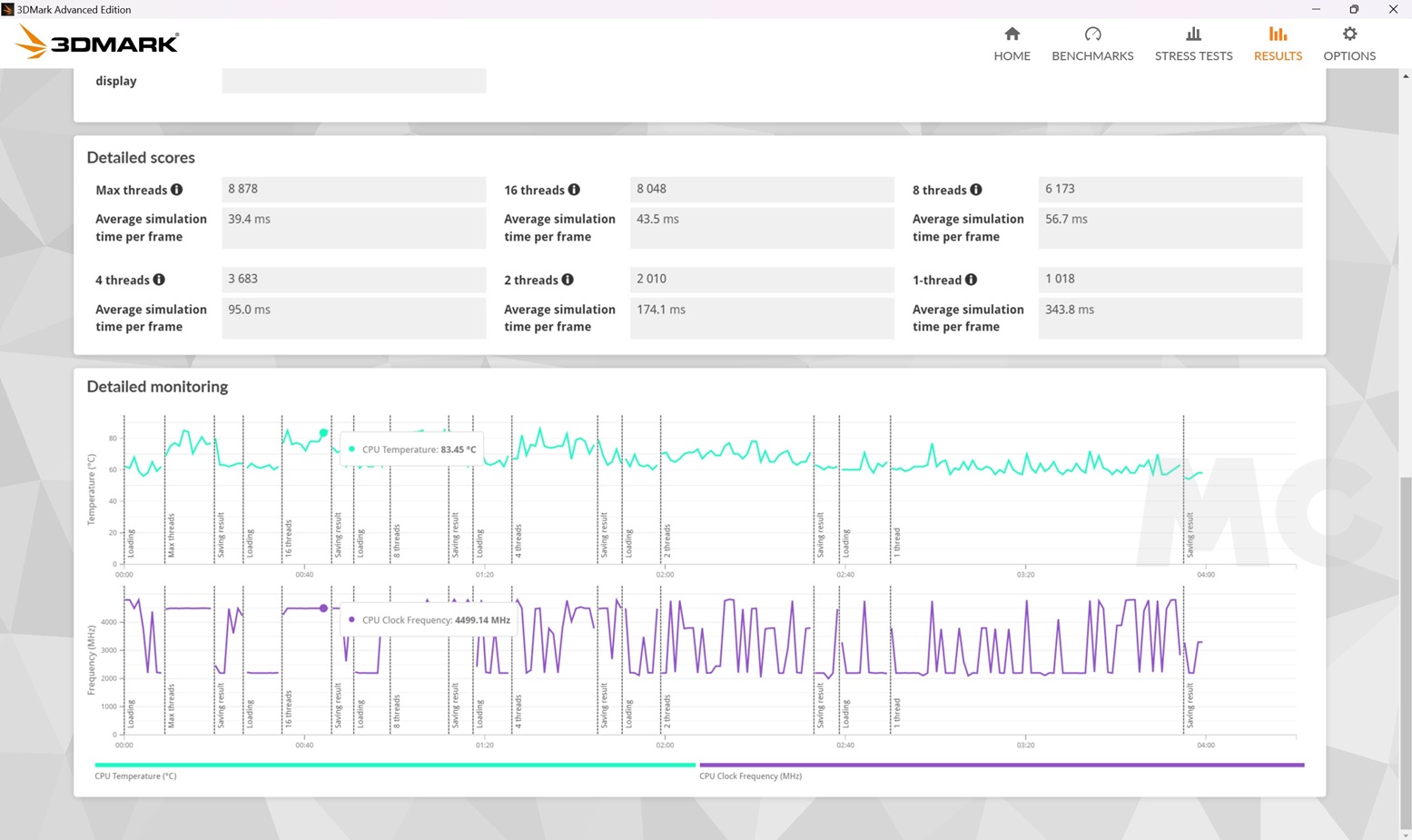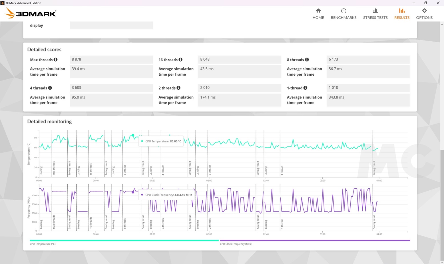 • Con ocho hilos activos la frecuencia es sorprendentemente estable alrededor de los 4,38 GHz, y la temperatura máxima es de 85 grados.