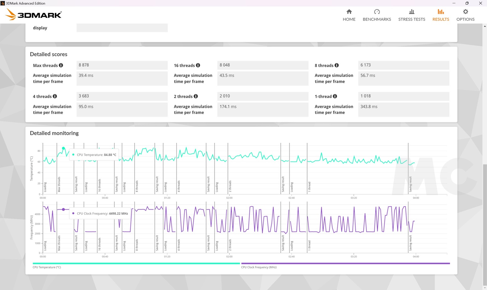 • Con todos los hilos activos la duración de la prueba es muy corta, pero aún así es suficiente para que el procesador llegue a los 84,88 grados C, y las frecuencias se mantienen estables en los 4,49 GHz.