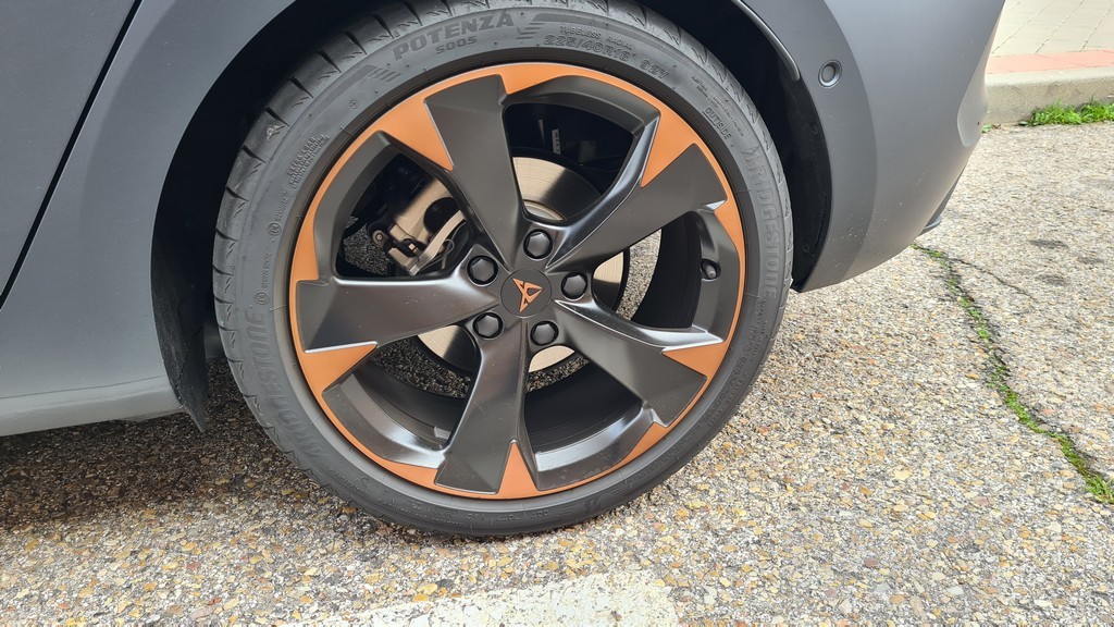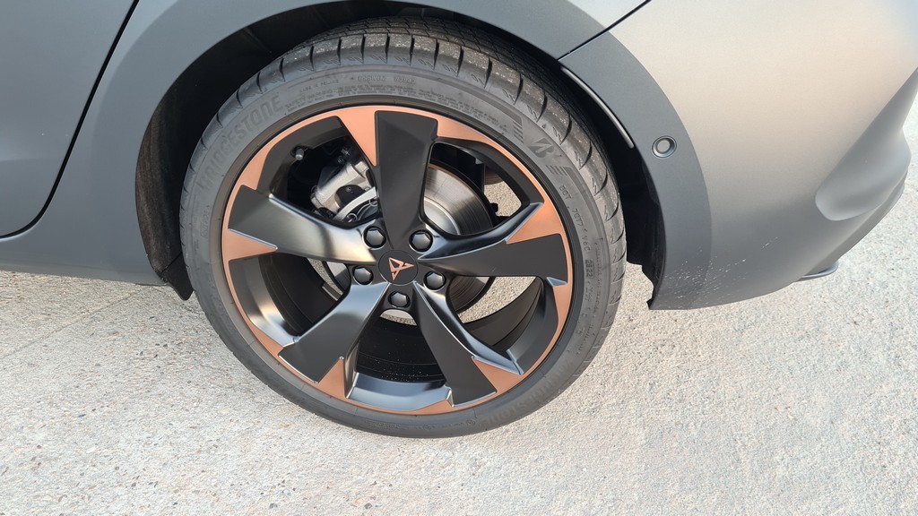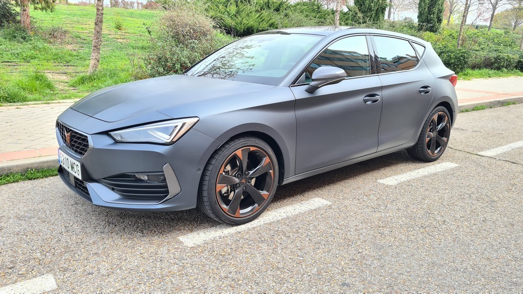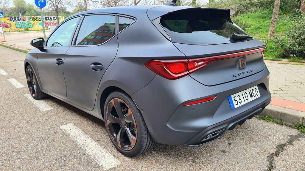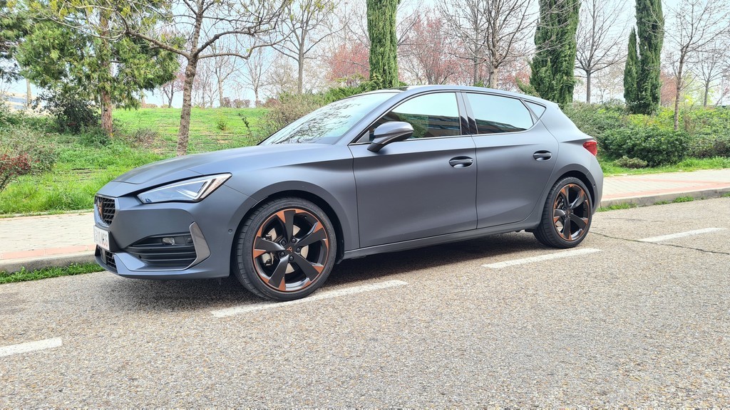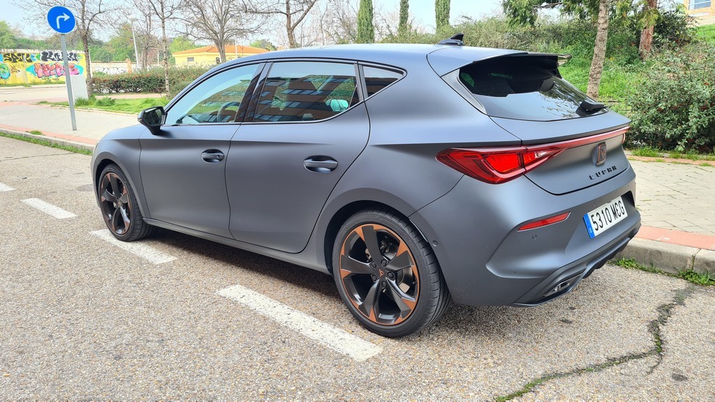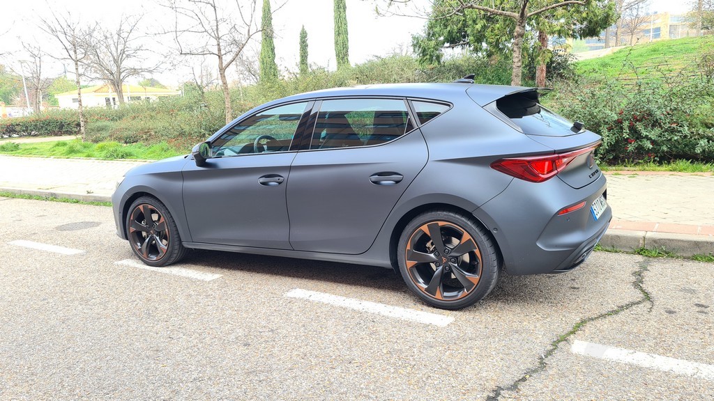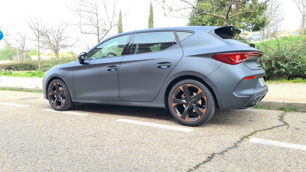 Las tomas de aire en este frontal son más grandes que en el modelo de SEAT subrayando así el caracter agresivo de este modelo. También tienen el acabado en negro que hemos señalado en el resto de elementos. El conjunto del frontal es muy agresivo y con un carácter marcadamente deportivo que son las señas de identidad del resto de los modelos de la gama Cupra con detalles de diseño que comparten todos ellos. En el lateral del coche las llantas de aleación de 18 pulgadas de diseño específico lucen unos detalles en color cobre que destacan sobre la carrocería de color negro mate.