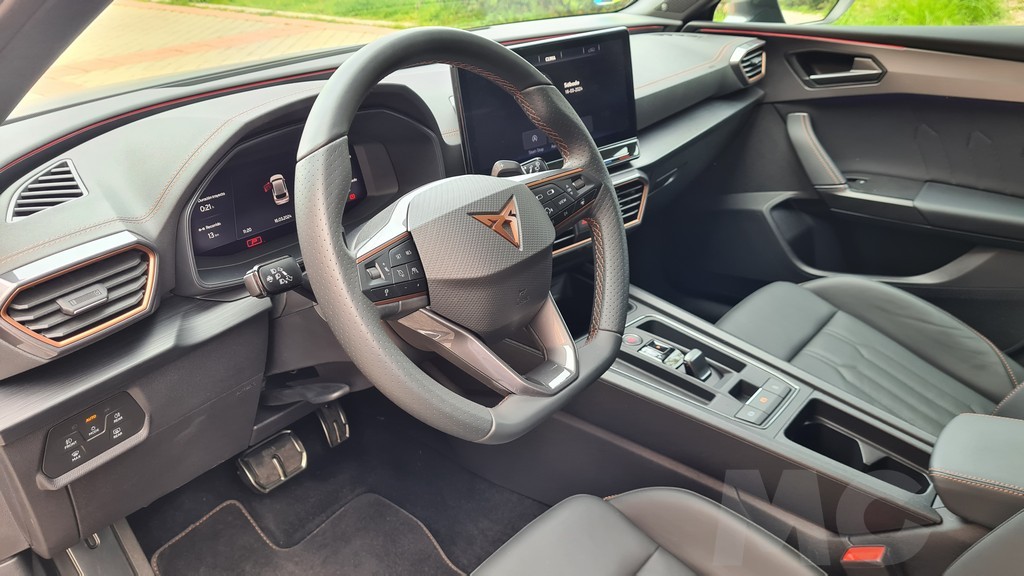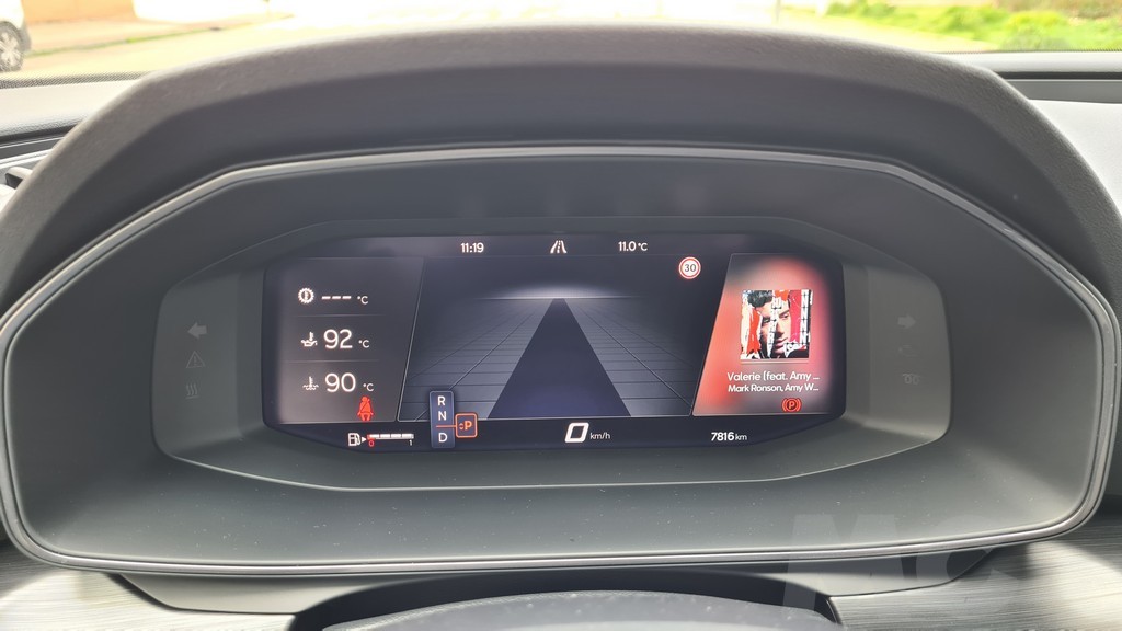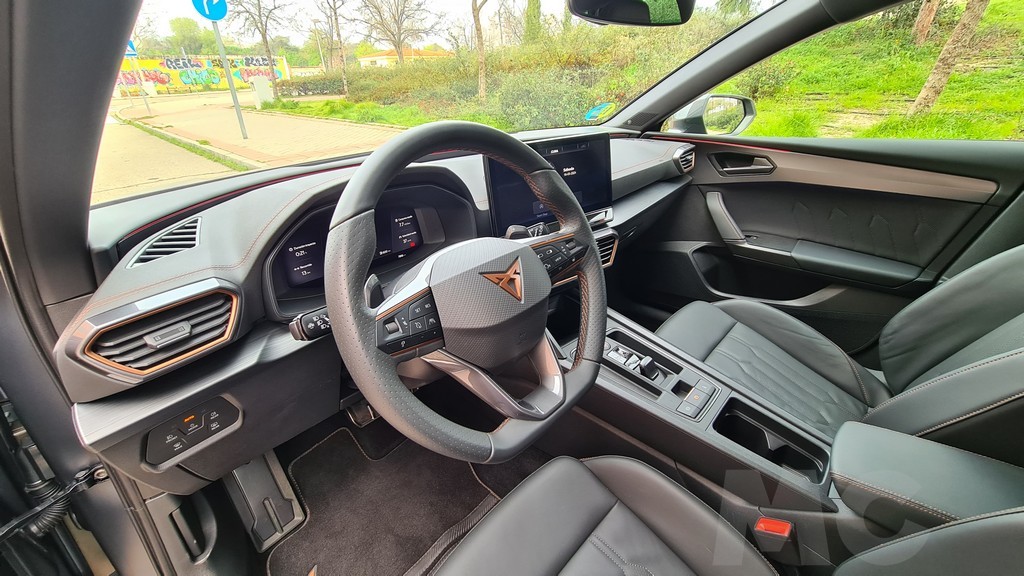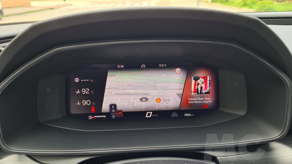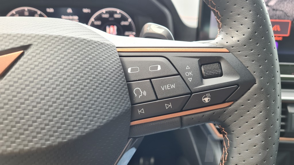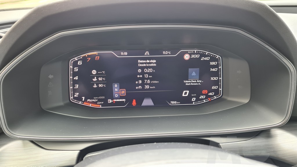 La instrumentación tras el volante consiste en el sistema Digital Cockpit, una pantalla de 10,25 pulgadas y es configurable para mostrar los datos que más nos interesen en el formato que más nos guste. En el caso de la versión de Cupra dispone además de datos específicos para la conducción deportiva como el valor de la aceleración longitudinal y transversal o la presión del sistema de sobrealimentación del motor. También permite mostrar en esta vista de conducción deportivoa la potencia entregada en todo momento por el sistema de propulsión.
