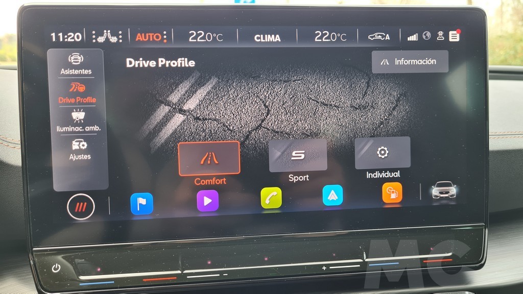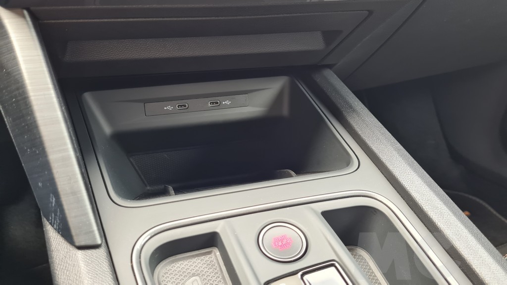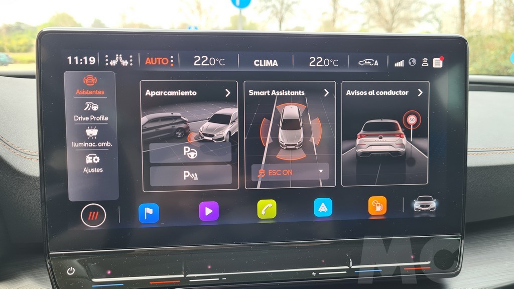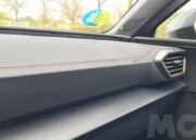 El salpicadero es prácticamente idéntico al del modelo de SEAT pero con una vez más destacan las inserciones en color cobrizo como en las molduras de las rejillas de ventilación que resaltan el aspecto deportivo. Por lo demás dispone de una pantalla para el sistema de información y multimedia de 10 pulgadas compatible con la versión inalámbrica tanto de Android Auto como de Apple Car Play. El espacio para depositar el teléfono móvil nos ha parecido bien diseñado ya que se encuentra debajo del salpicadero en un hueco con una inclinación que impide que se pueda mover cuando aceleramos.