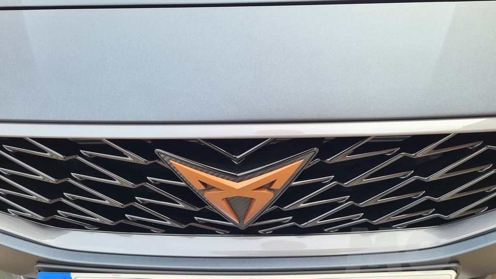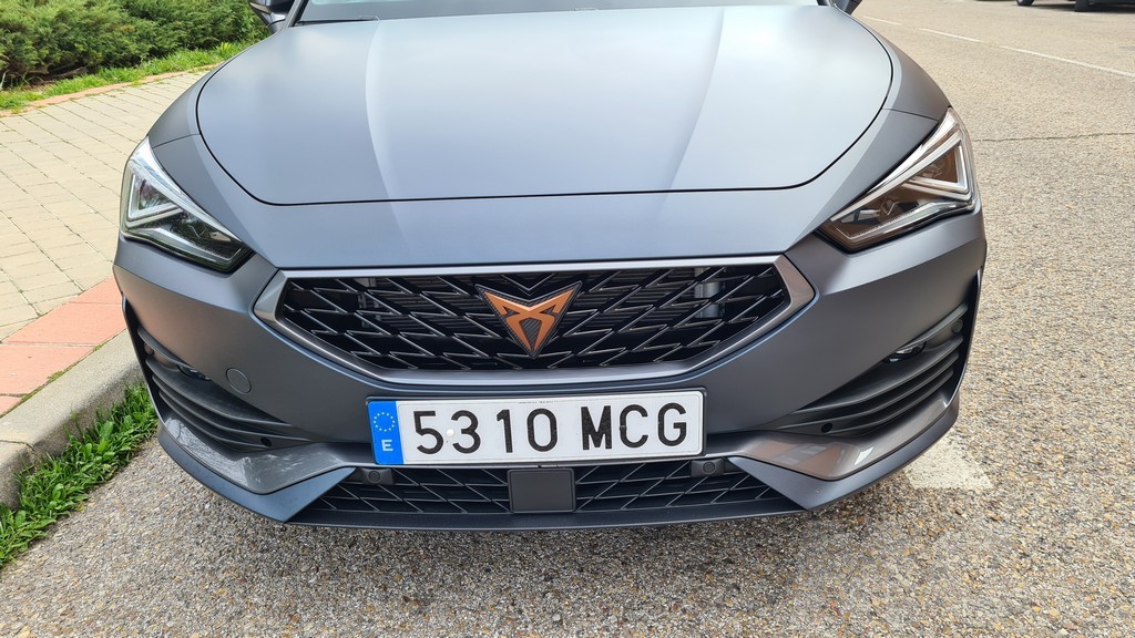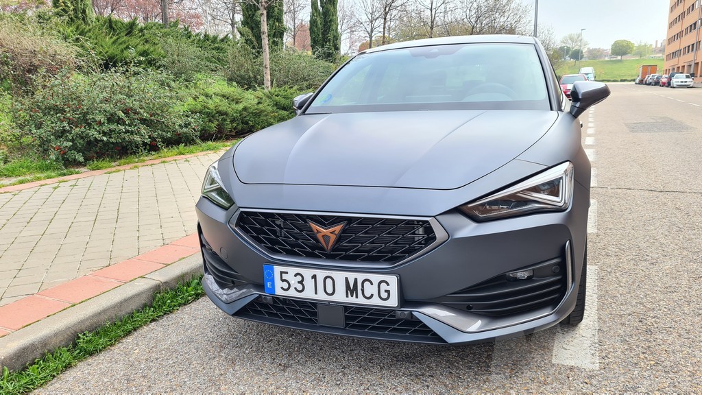 El aspecto exterior de este Cupra León transmite sin duda las intenciones de la marca de ofrecer un modelo con una personalidad marcadamente deportiva. Tiene muchas similitudes con el modelo del mismo nombre de SEAT pero con muchos detalles distintos que hacen que sea muy fácil de distinguir de su hermano de grupo. En la parte frontal destaca una parrilla y un contorno o moldura para los faros más oscuros con detalles inspirados en el aspecto de la fibra de carbono. En el centro de la parrilla encontramos el logotipo de la marca en color rojo que resalta sobre el color negro de la misma.
