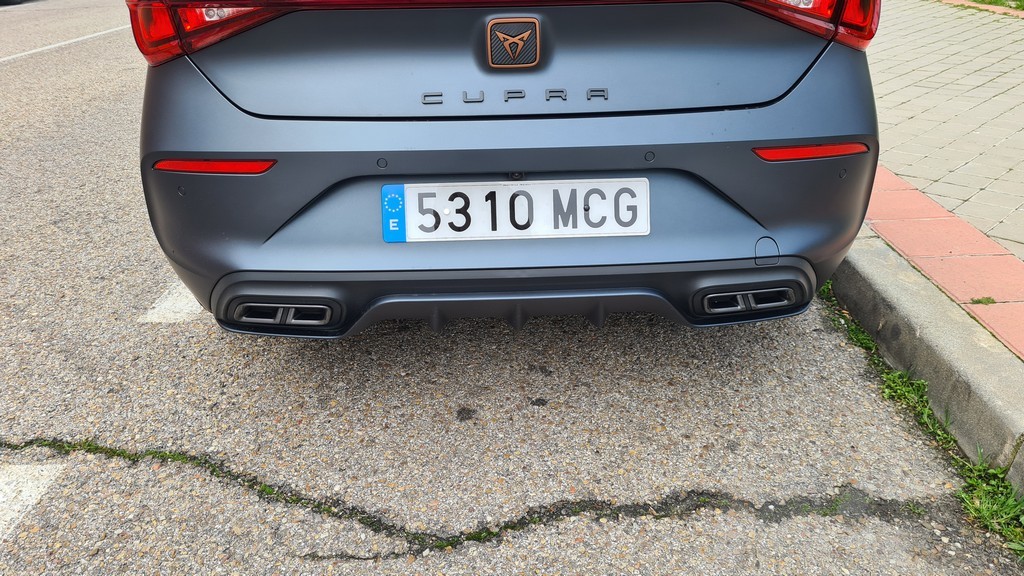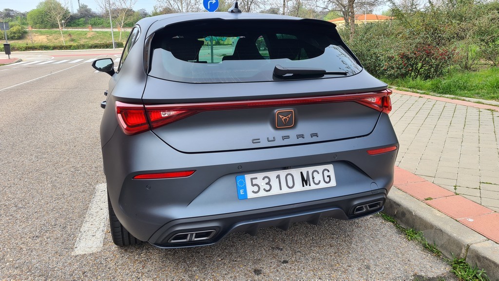 En la parte posterior de este León destaca el alerón en color negro de pequeño tamaño situado como extensión del alerón principal colocado por encima de la luna trasera del maletero. Tiene además un difusor posterior específico de este modelo que muestra su parte central pintada en el mismo color que la carrocería, negro mate que subraya con otro detalle más la deportividad que se ha querido imprimir al aspecto de este coche. Los tubos de escape son de diseño deportivo y en el caso de este versión a cargo de Cupra son dobles a diferencia de la versión de SEAT.