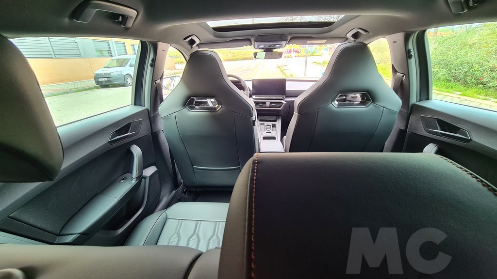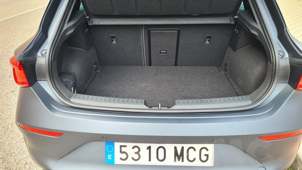 El maletero de este Cupra León tiene una capacidad de 380 litros, que es un espacio bastante amplio para la categoría y el acceso es bastante cómodo a pesar de la presencia de un escalón. Además es regular en cuanto a volumen y permite abatir los asientos traseros para lograr una capacidad total de carga que puede alcanzar los 1.300 litros. Se hace de forma sencilla aunque el mecanismo es accesible desde la parte de los pasajeros. También se puede abatir el reposabrazos central de las plazas traseras para introducir en el maletero objetos de gran longitud sin abatir los asientos.