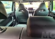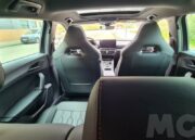 En el interior lo primero que llama la atención son los asientos deportivos tipo baquet que integran unos grandes reposacabezas donde se encuentra bordado el logotipo de la marca. Son asientos que sujetan muy bien el cuerpo en las curvas que están realizados en un material tipo cuero sintético con pespuntes en color negro. El volante también está forrado con el mismo material pero con costuras en cobre y con el logotipo en el centro del mismo. También luce una serie de inserciones en el mismo color en la parte de los botones dispuestos en los radios del volante.