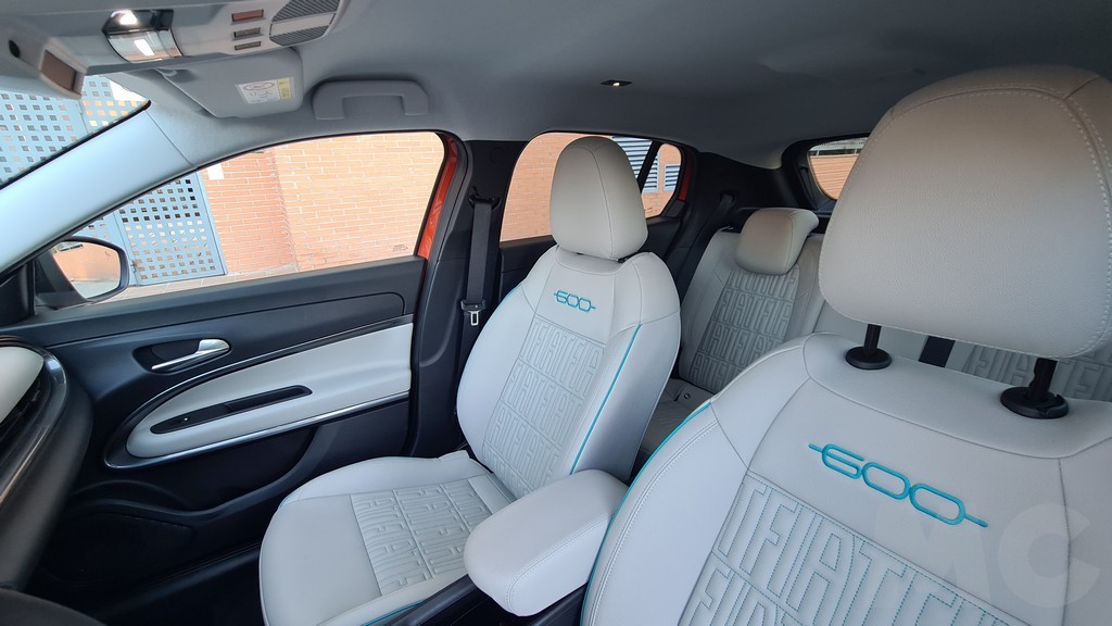 La pantalla que hace las veces de instrumentación se encuentra contenida en un parasol de forma circular muy parecido al que englobaba la espartana instrumentación del Fiat y Seat 600 original. Quizás sea una pieza demasiado grande para la pantalla rectangular de siete pulgadas que contiene pero el efecto de vuelta al pasado está conseguido. Los asientos son cómodos y lucen unas costuras en relieve que dibujan tanto el nombre de la marca como el del modelo del coche en la parta alta del respaldo en color azul. La pantalla del sistema de información y entretenimento sobresale de la parte superior del salpicadero y tiene un tamaño de 10 pulgadas.