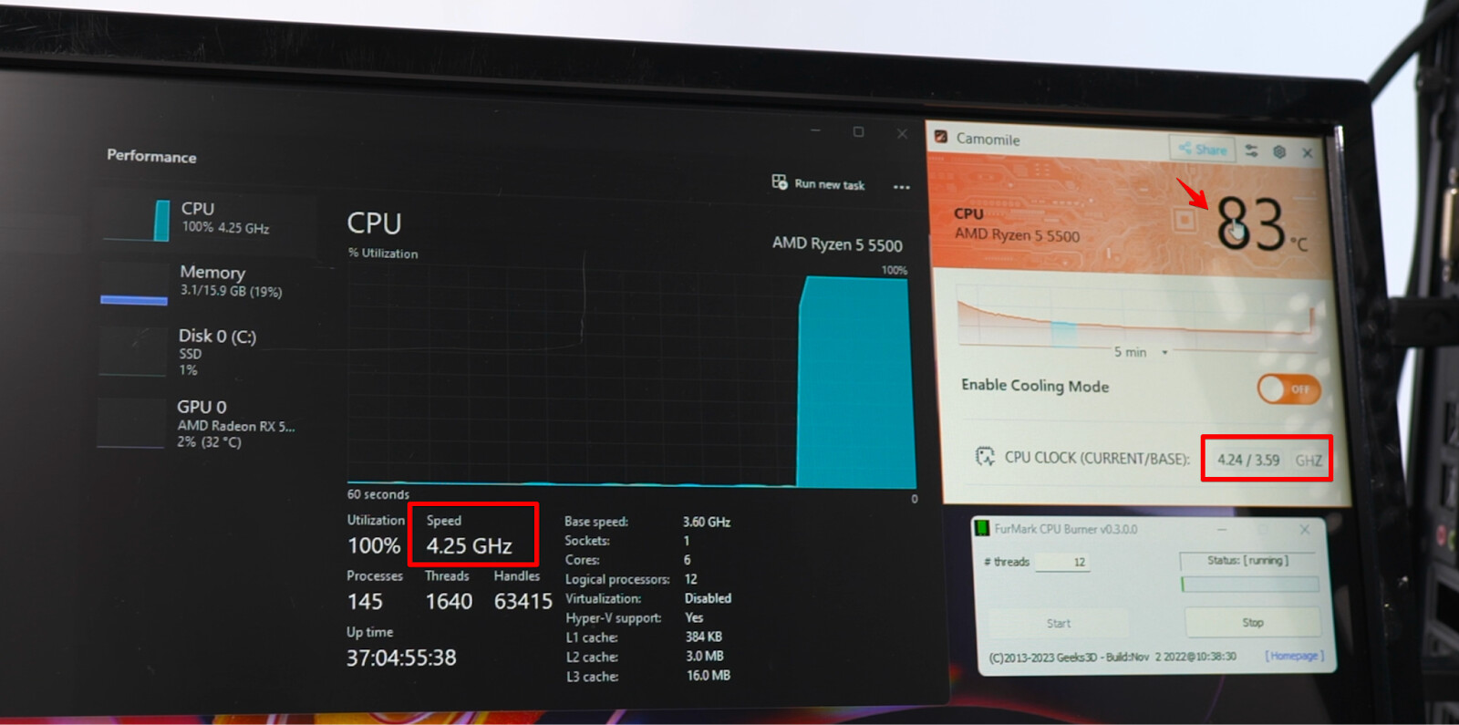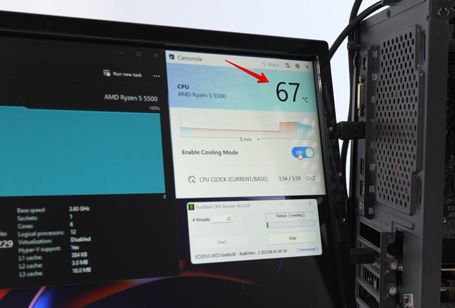 La aplicación funciona correctamente y cumple con lo que promete, puedo dar fe de ello, pero debéis tener en cuenta que no hace milagros, y que al final lo que aplica es una reducción de la frecuencia de trabajo de la CPU para que la temperatura baje, con la consiguiente pérdida de rendimiento. Por ejemplo, un Ryzen 5 5500 funcionando a 4,25 GHz con una temperatura de 83 grados pasa a una temperatura de 67 grados al activar esta aplicación, pero su velocidad cae a 3,59 GHz, como podéis ver en la galería adjunta.