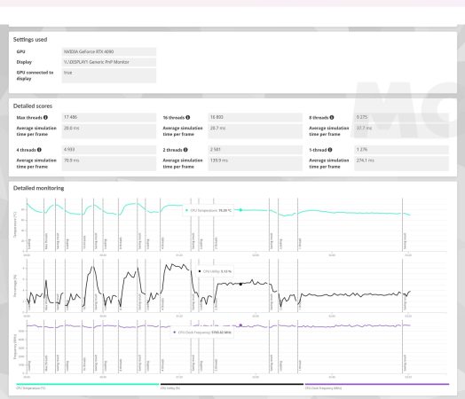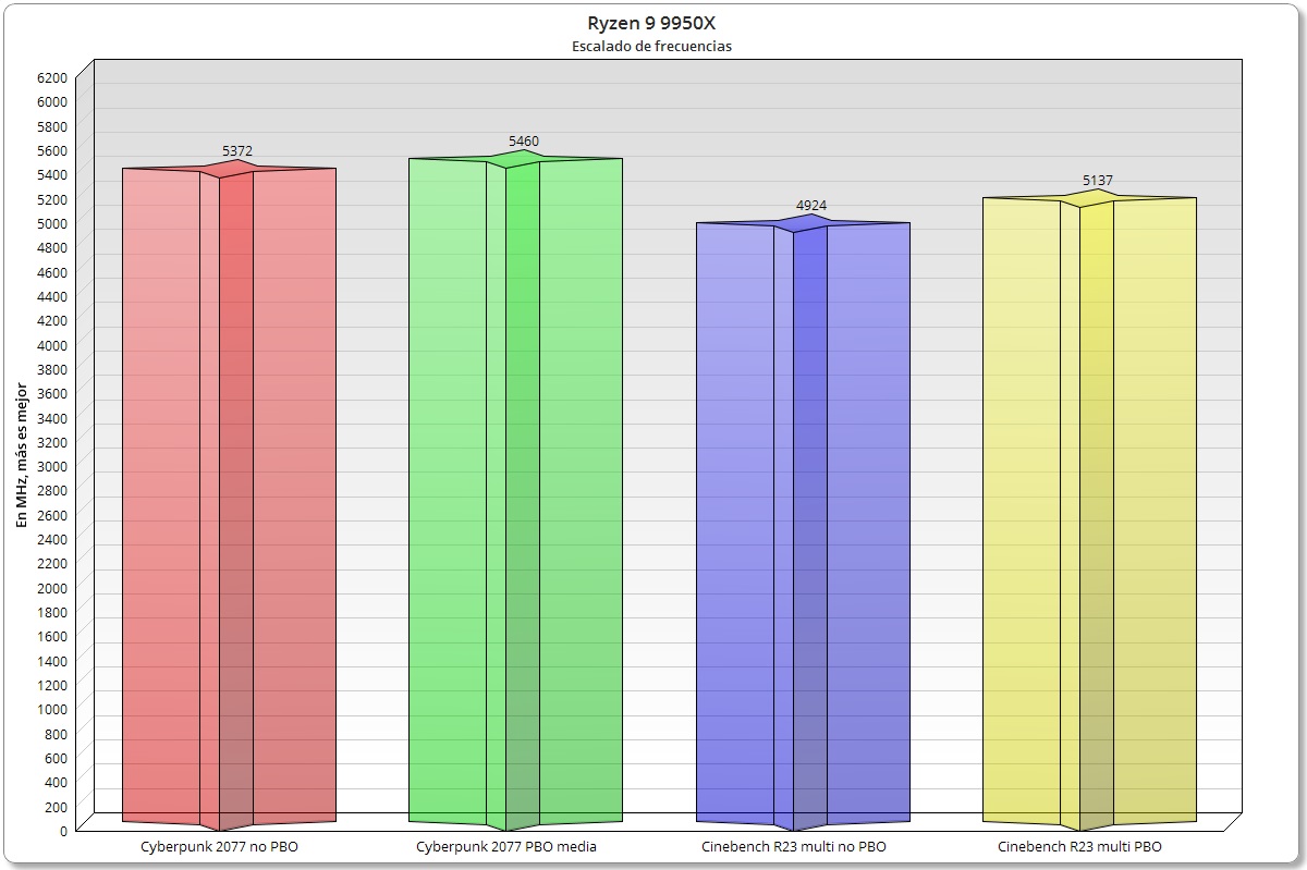 El Ryzen 9 9950X escala muy bien sus frecuencias de trabajo. Ya lo vimos en la prueba de 3DMark CPU, pero quiero profundizar en este tema viendo los resultados de otras pruebas. En juegos el escalado de frecuencia es muy bueno incluso sin PBO activado. Cyberpunk 2077 no es capaz de saturar todos los núcleos del Ryzen 9 9950X, solo escala bien en 8 núcleos y 16 hilos, y esto le permite mantener unas frecuencias por encima de los 5,3 GHz.