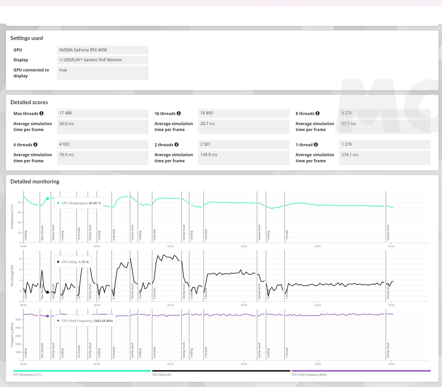 - Con el máximo número de hilos el procesador trabaja con 32 hilos, pero de nuevo la prueba dura muy poco tiempo, y por eso la temperatura solo llega a 87,69 grados C y la frecuencia se mantiene en 5,44 GHz.