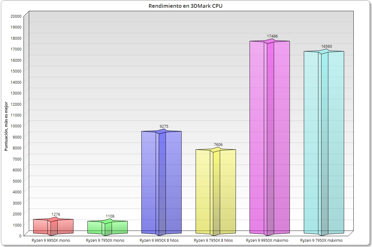 Como cabía esperar gana al Ryzen 9 7950X en todas las subpruebas, aunque las diferencias más abultadas las tenemos en las pruebas de 8 hilos y de 16 hilos, donde gana por 9.275 puntos a 7.606 puntos, y por 16.893 puntos a 13.426 puntos. En monohilo gana por 1.276 puntos a 1.108 puntos.