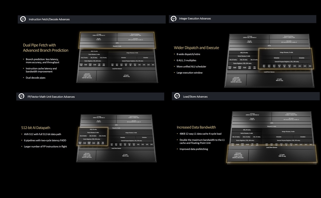- Se ha aumentado la cantidad de caché L1 de 32 KB a 48 KB y pasa a tener 12 direcciones.