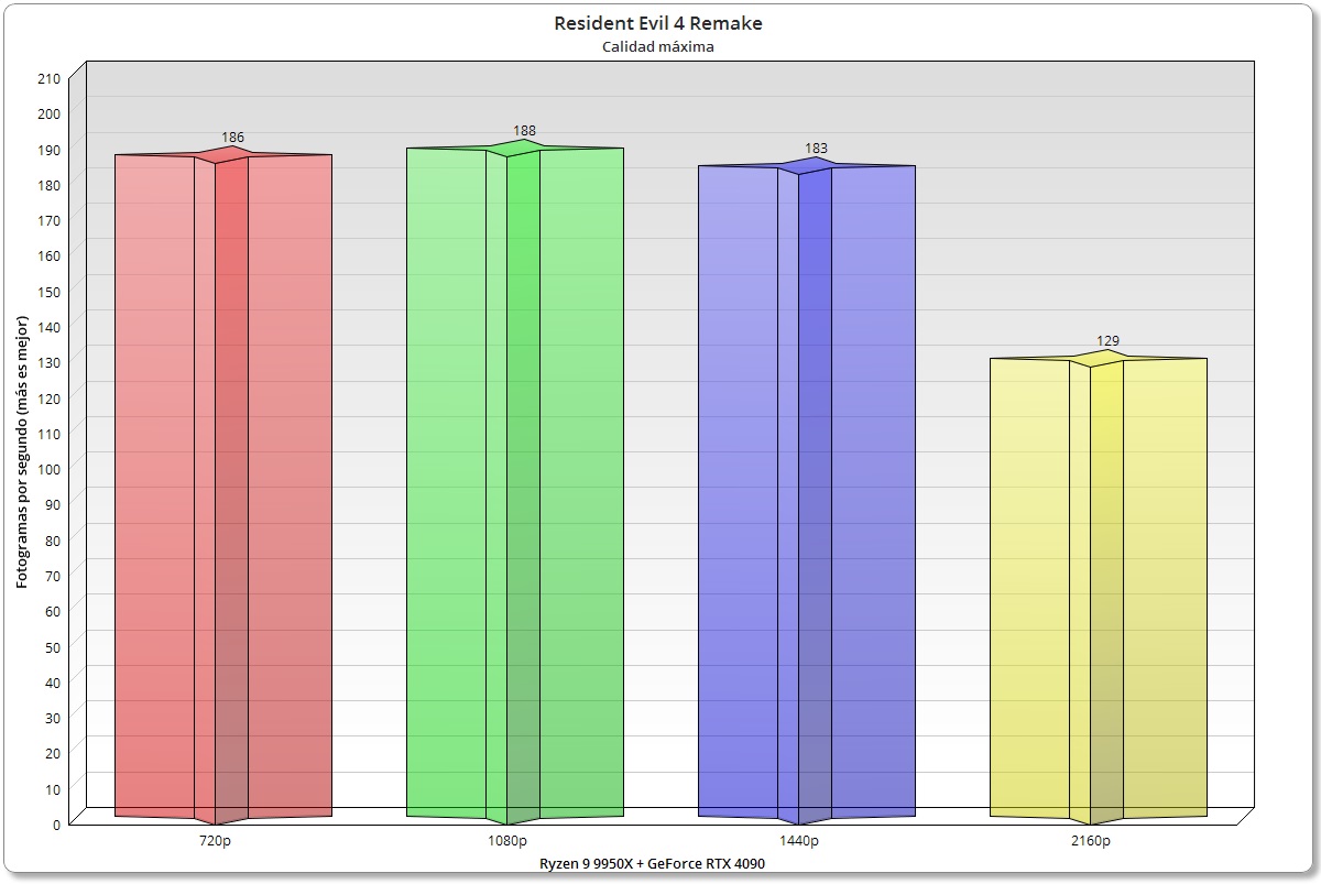 Con Resident Evil 4 Remake tenemos un cuello de botella claro incluso en 1440p, de hecho el rendimiento mejora levemente al subir de 720p a 1080p porque aumenta ligeramente la tasa de uso de la GPU. En 2160p la pérdida de rendimiento es pequeña en proporción al aumento de resolución, lo que no hace más que confirmar la dependencia del juego de la GPU. A pesar de todo, los resultados que consigue el Ryzen 9 9950X son buenos.