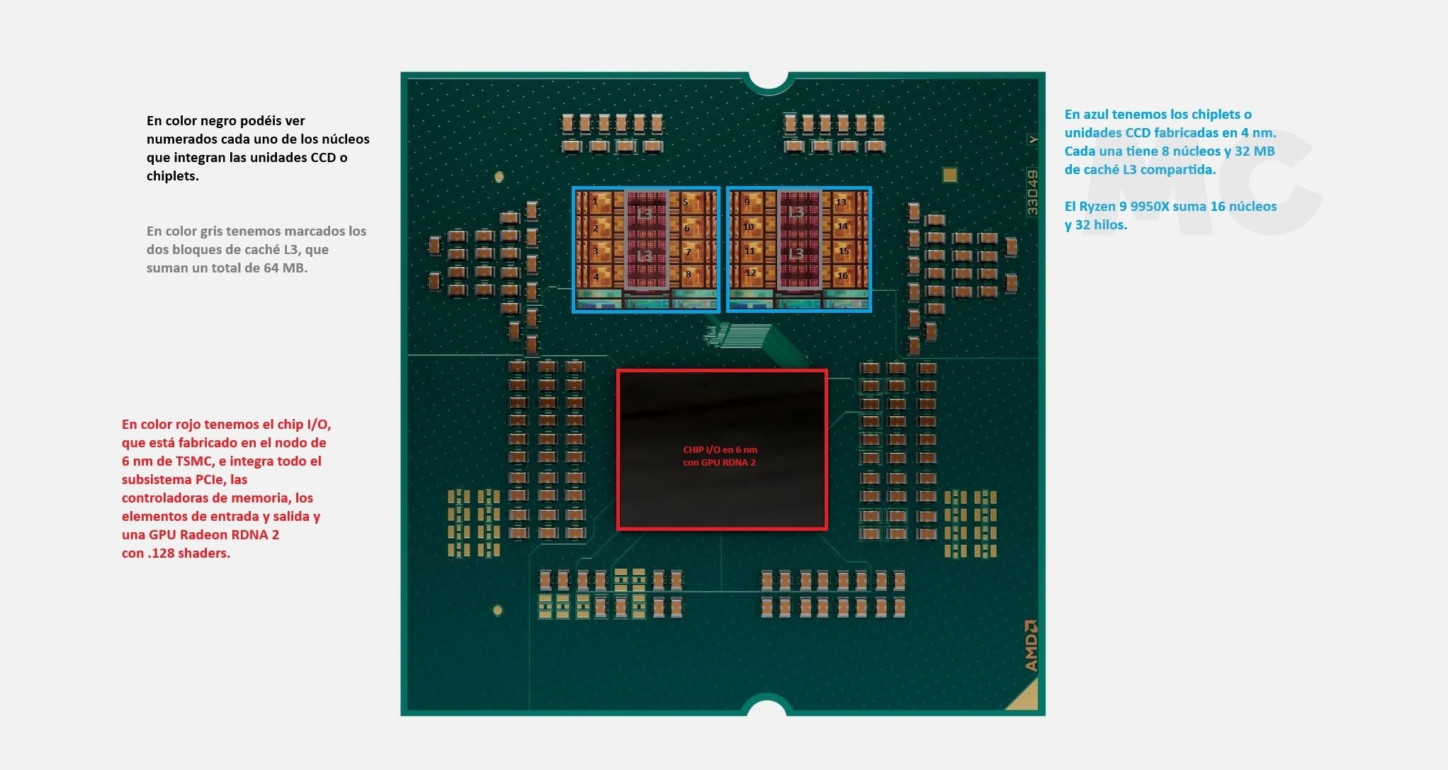 Ryzen 9 9950X: tres chiplets interconectados y nuevo nodo