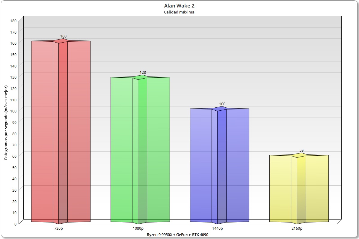 Esto que os acabo de explicar no ocurre con juegos muy exigentes, como por ejemplo Cyberpunk 2077 o Alan Wake 2, que no muestran variaciones de rendimiento en 4K al utilizar el Ryzen 9 9950X o el Ryzen 9 7950X.
