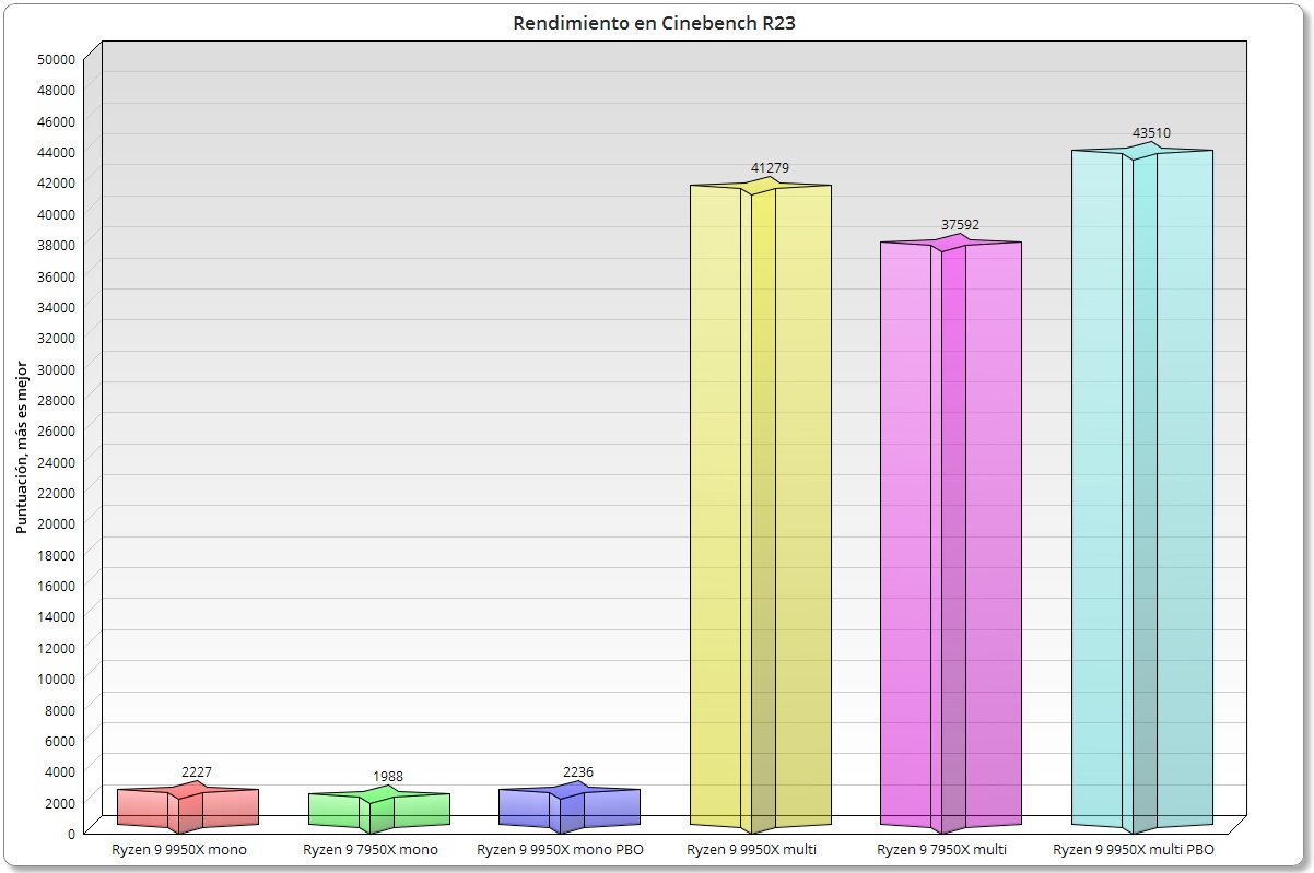 Sin PBO el Ryzen 9 9950X consigue 2.227 puntos en monohilo y 41.279 puntos en multihilo. Con PBO activado tenemos 2.236 puntos en monohilo y 43.510 puntos en multihilo. Son números muy buenos, solo tenemos que comprara con el Ryzen 9 7950X para comprobarlo, y es justo lo que voy a hacer ahora mismo.