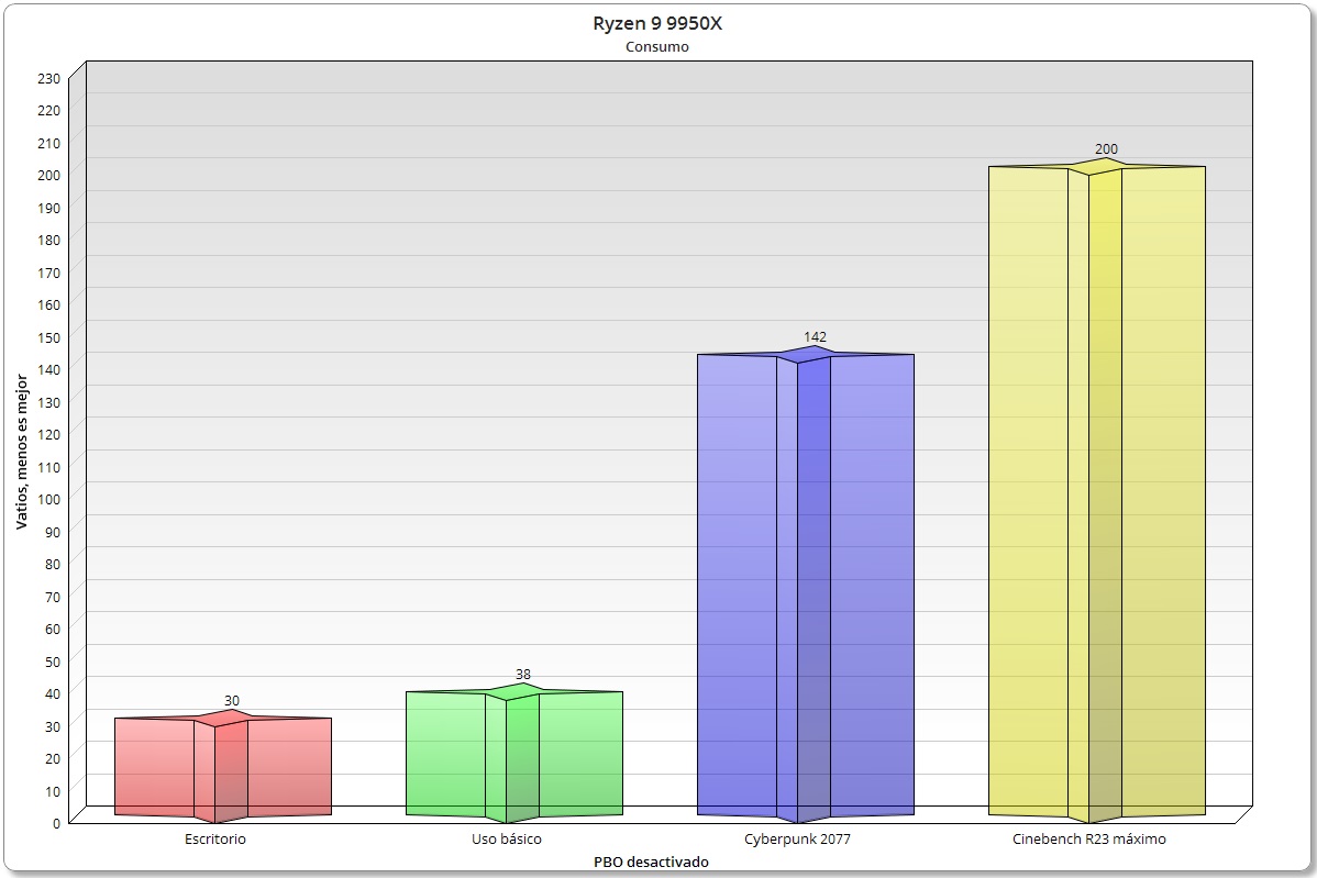 Los valores de consumo entran dentro de lo esperado. En juegos el Ryzen 9 9950X escala de forma agresiva el modo turbo para mejorar el rendimiento y esto se nota en el consumo, cosa que también ocurre en Cinebench R23, aunque el pico máximo de consumo en este caso fue de 200 vatios.