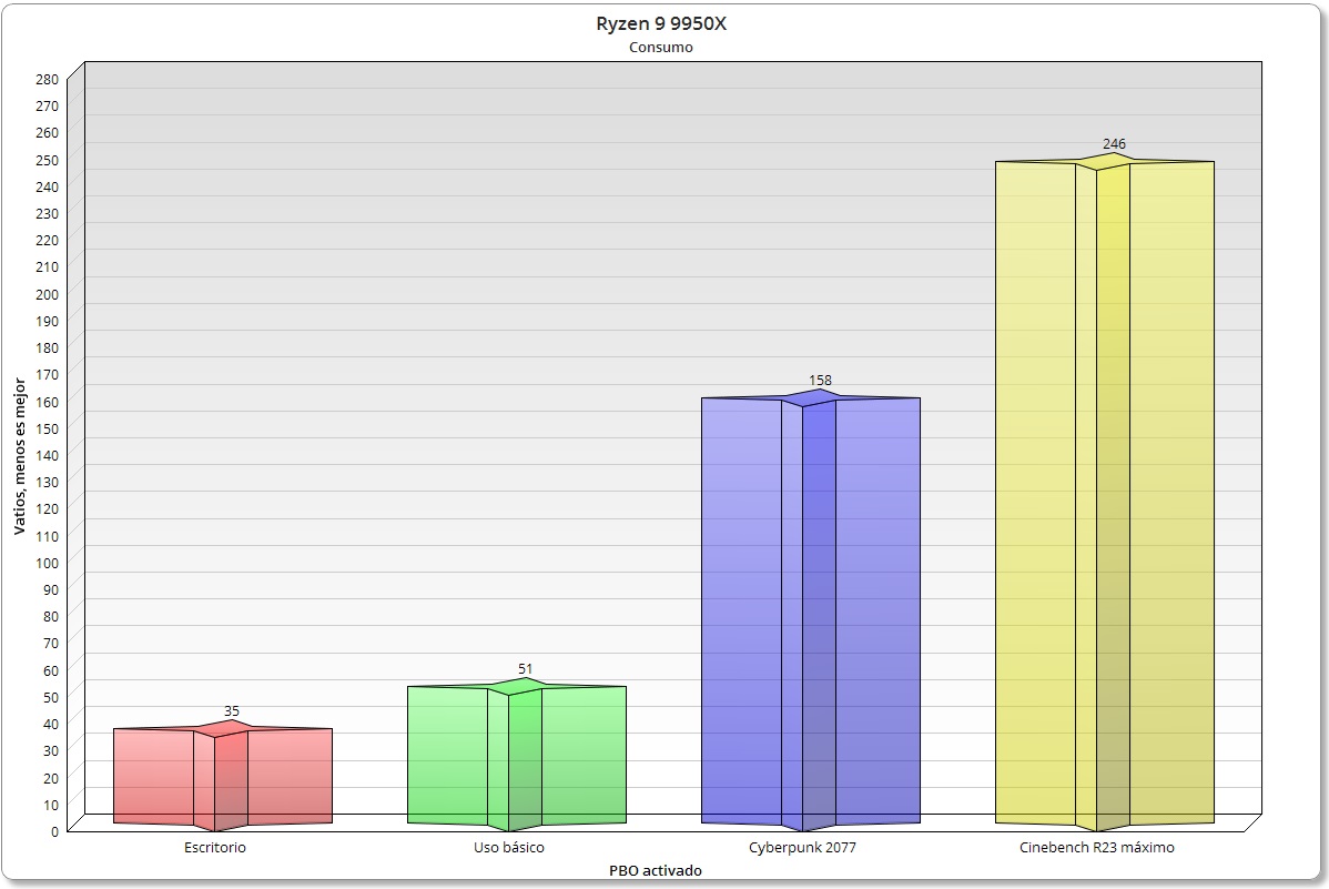 En general los valores de consumo y de temperatura que registran los Ryzen 9 9950X y Ryzen 9 7950X son muy parecidos. El Ryzen 9 7950X registró un pico de consumo de 247 vatios con PBO activado en Cinebench R23, y sin PBO se mueve entre los 220 y los 230 vatios también en dicha prueba, así que en este sentido no veo ninguna mejora relevante.