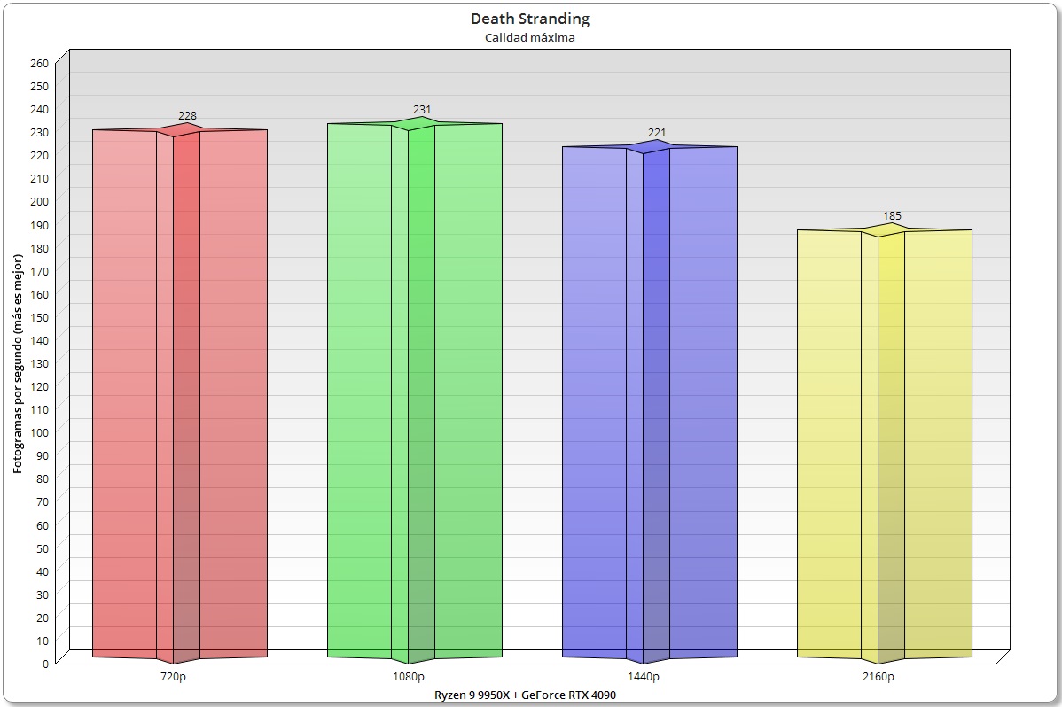 Death Stranding es un juego que ya no representa ningún desafío para cualquier PC gaming actual, pero es ideal para ver cómo se comportan los procesadores ante un cuello de botella tan marcado. Como podemos ver la GeForce RTX 4090 es tan potente que se produce cuello de botella incluso en 1440p, y el escalado al pasar a 2160p es mucho menos marcado que en otros casos, ya que el rendimiento pasa de 221 FPS a 185 FPS.