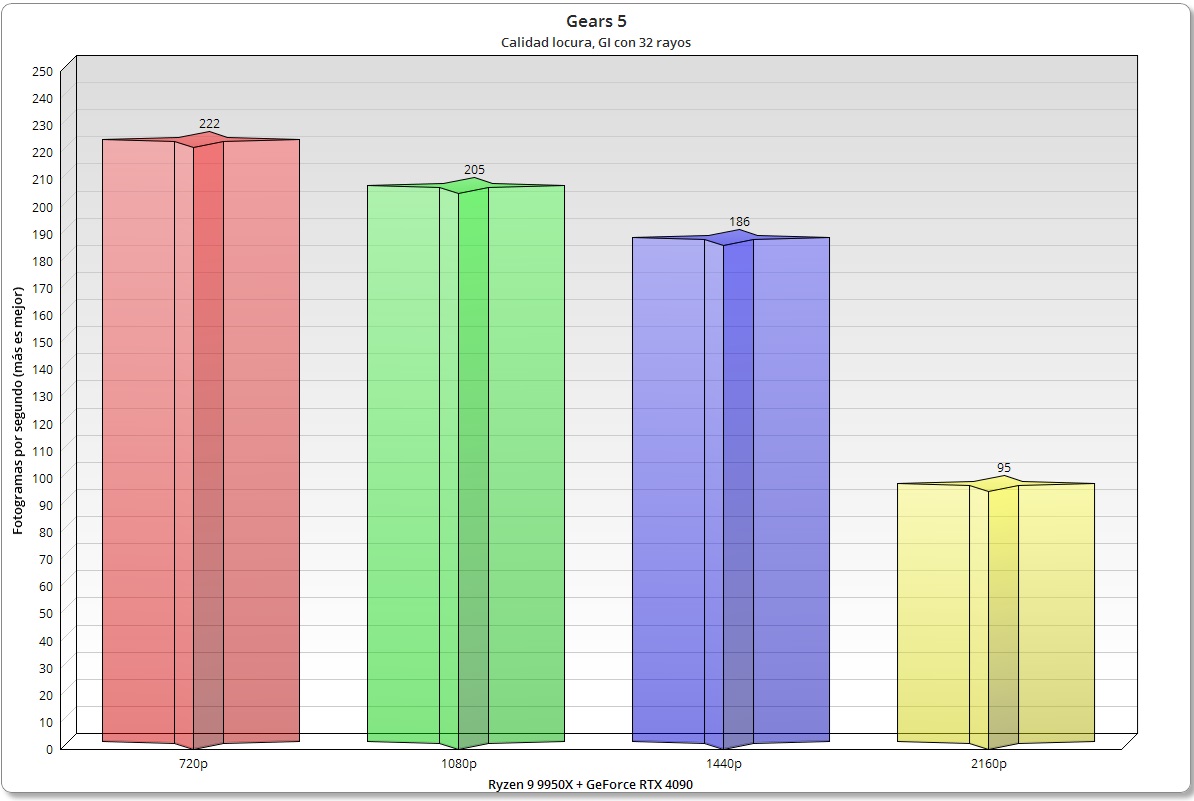 Gears 5 es el summum de los juegos basados en el Unreal Engine 4, una auténtica maravilla a nivel técnico que ha envejecido muy bien, y que puede presumir de tener una optimización muy cuidada. El Ryzen 9 9950X no solo consigue buenos resultados en todas las resoluciones, sino que además escala bien y supera al Ryzen 9 7950X.