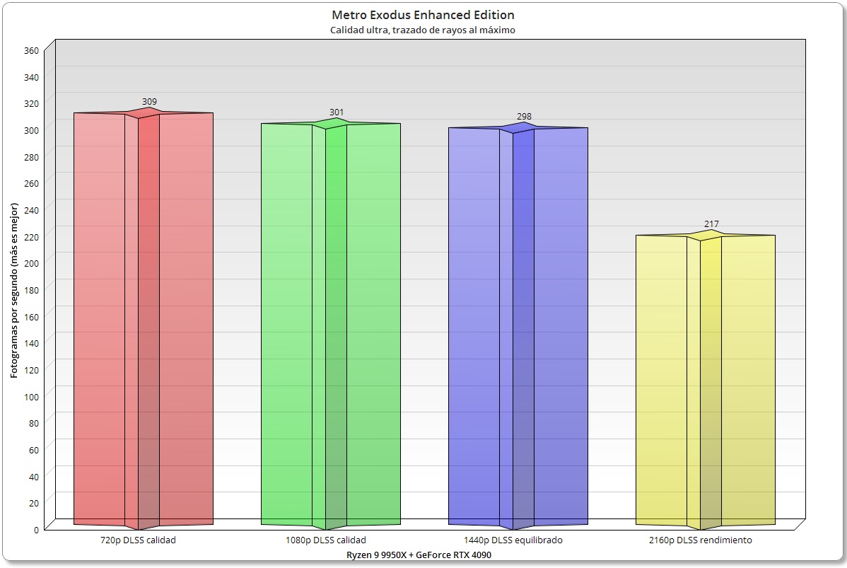Metro Exodus Enhanced Edition es el primer juego que exige tener una tarjeta gráfica con aceleración de trazado de rayos. Ha envejecido muy bien, sigue siendo una auténtica maravilla técnica, y es muy exigente a nivel de GPU. Aplicando NVIDIA DLSS aumentamos la carga sobre la CPU, y la dependencia de la GPU de esta.