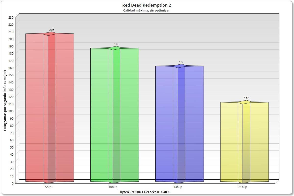 Vamos con otra de las joyas de la anterior generación. Red Dead Redemption 2 es un título que sigue siendo muy exigente, aunque a nivel de CPU tiene una mayor dependencia del rendimiento monohilo que del multihilo una vez que llegamos a un valor de seis núcleos y doce hilos. El Ryzen 9 9950X registra unos valores muy buenos y un escalado óptimo incluso en 720p y 1080p.