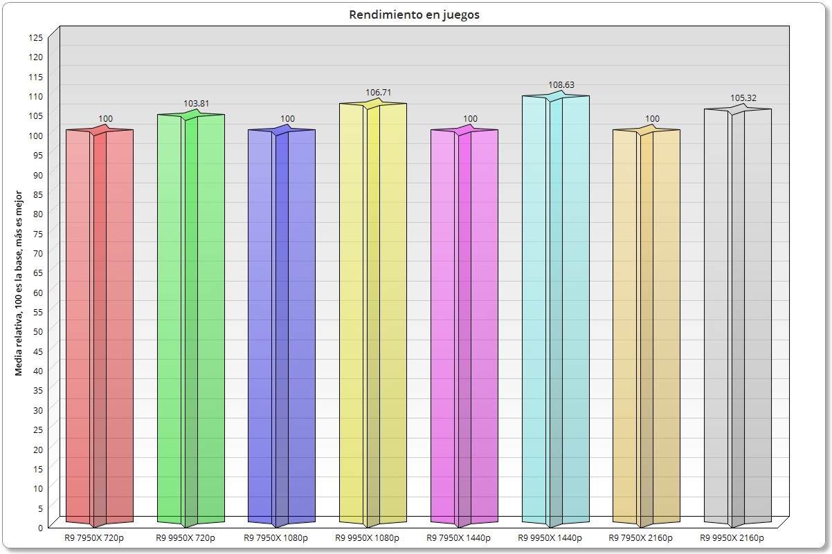 Se aprecia de forma clara una mejora frente al Ryzen 9 7950X, y un rendimiento a veces superior y a veces inferior al del Ryzen 7 9700X, algo que es lógico porque a pesar de que el Ryzen 9 9950X funciona a mayor frecuencia y tiene más núcleos e hilos no debemos olvidarnos de que, al final, los juegos actuales no suelen escalar bien en más de seis núcleos y doce hilos.