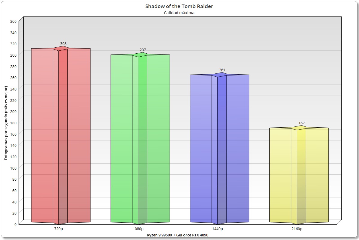 Arrancamos esta ronda de pruebas con Shadow of the Tomb Raider. Los resultados que obtiene el Ryzen 9 9950X son muy buenos, y superan de forma clara al Ryzen 9 7950X incluso en 4K, debido a que se trata de un juego que ya no es tan exigente para los tiempos que corren, y también a la enorme potencia de la GeForce RTX 4090, que va sobrada con este juego.