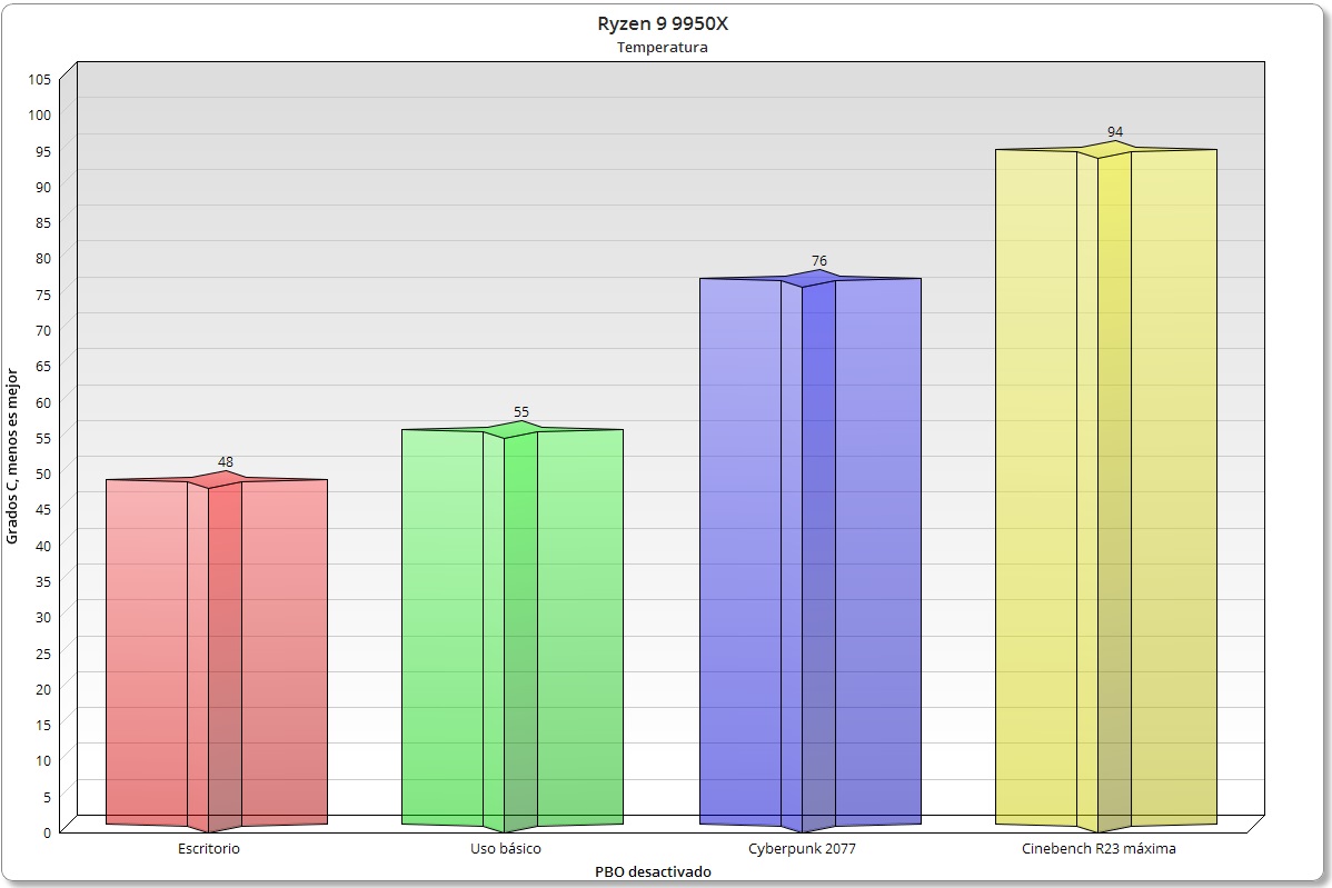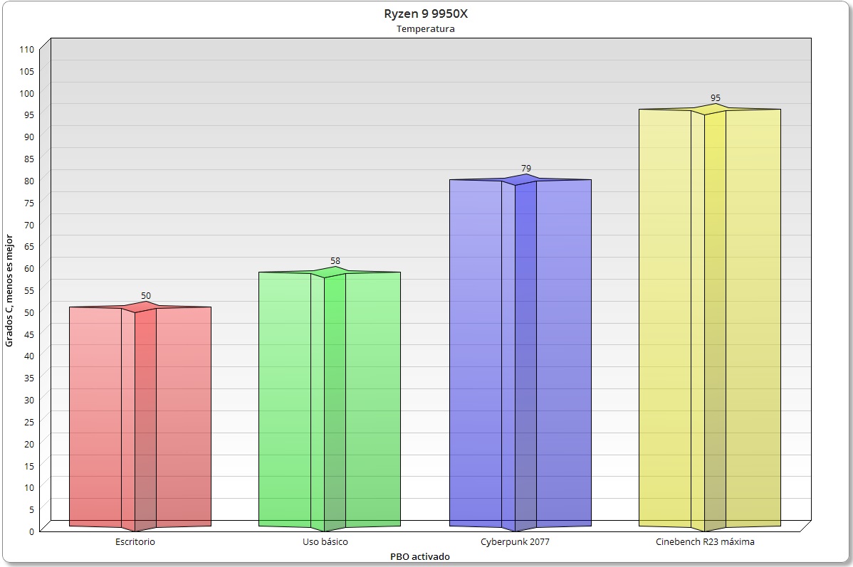 Al activar PBO se produce un incremento generalizado de la temperatura. En juegos los valores oscilan entre los 74 y los 79 grados, y en Cinebench R23 nada más comenzar la prueba ya nos encontramos con un pico de 95,3 grados casi instantáneo, que se mantiene totalmente estable gracias al ajuste de frecuencias y de consumo que se produce en tiempo real. Tampoco detecté ningún problema de estabilidad.