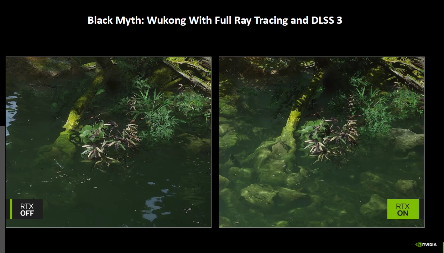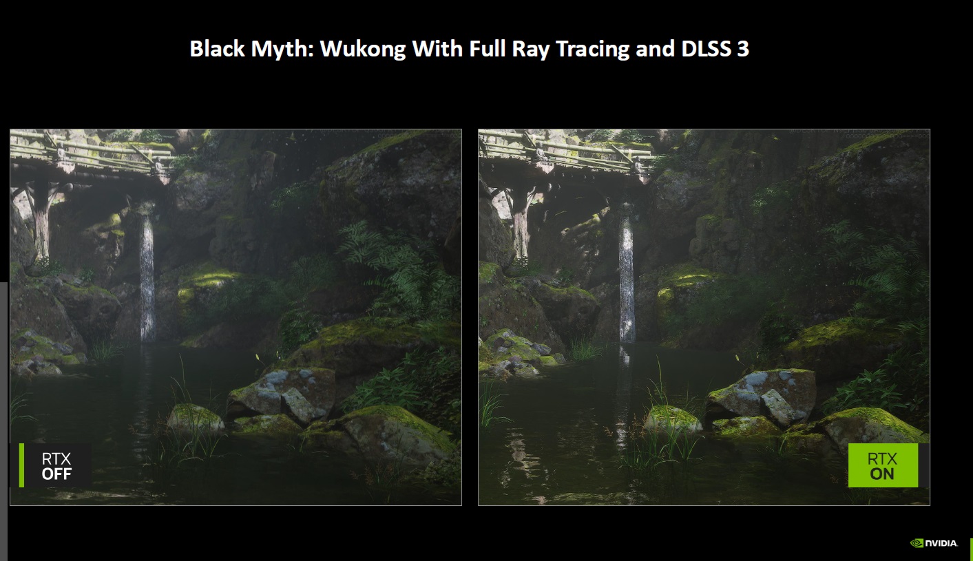 Esta tecnología ha hecho maravillas en Black Myth Wukong, un juego que cuenta con soporte de trazado de rayos completo y que, como podemos ver en las imágenes comparativas, la calidad gráfica mejora muchísimo al activarla. Su impacto en el rendimiento es notable, como os conté en su momento, y para disfrutar del juego con fluidez activando trazado de rayos debemos recurrir a NVIDIA DLSS Super Resolution y a Frame Generation.