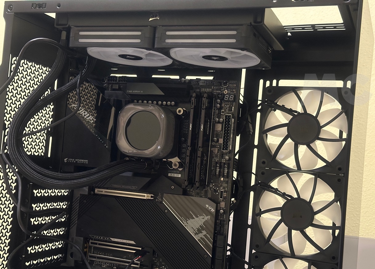 Siguiendo con el montaje, mi primer paso siempre es instalar la CPU en la placa base. Acto seguido coloqué la placa de retención en la parte trasera de la placa, porque es un socket LGA1700, apliqué pasca térmica y monté la bomba del kit de refrigeración líquida. Hecho esto, queda montar la RAM y la unidad SSD. Ahora es cuando podemos colocar la placa base en el chasis.