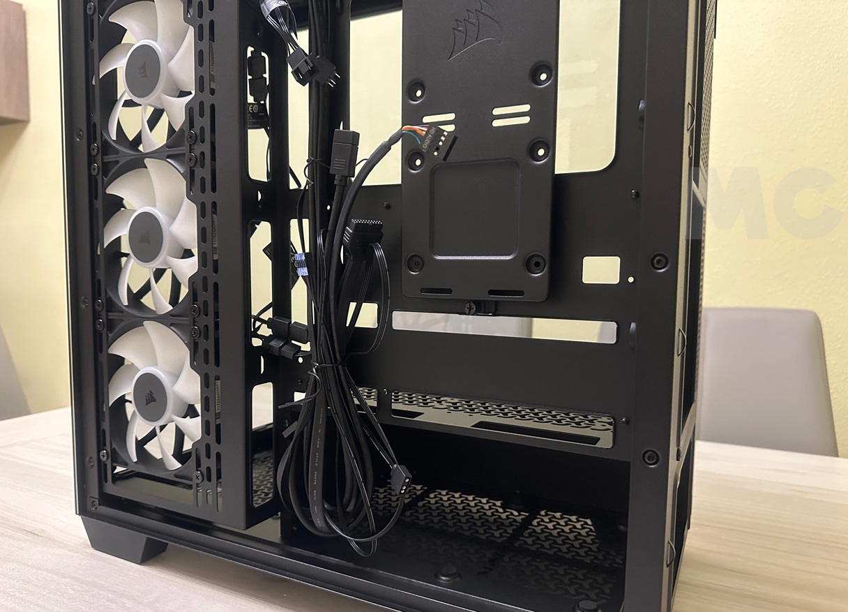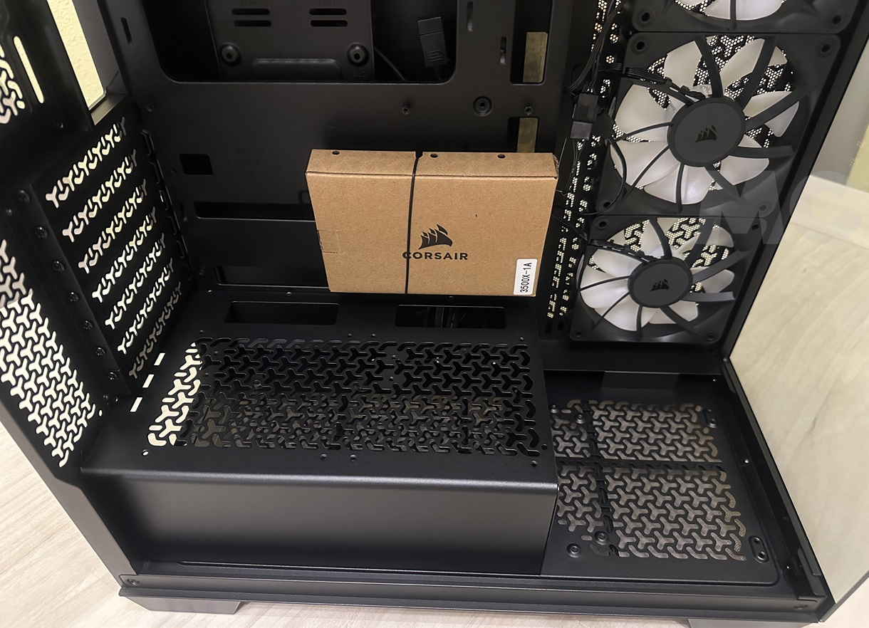 El Corsair 3500X tiene dos espacios donde podemos cuadrarlo a la perfección, pero antes de ello decidí pasar los cables de la refrigeración líquida a la parte trasera por el espacio superior la esquina inferior izquierda y montar la fuente de alimentación, porque este concentrador también se conecta a la fuente y necesitaba cuadrar bien el recorrido.
