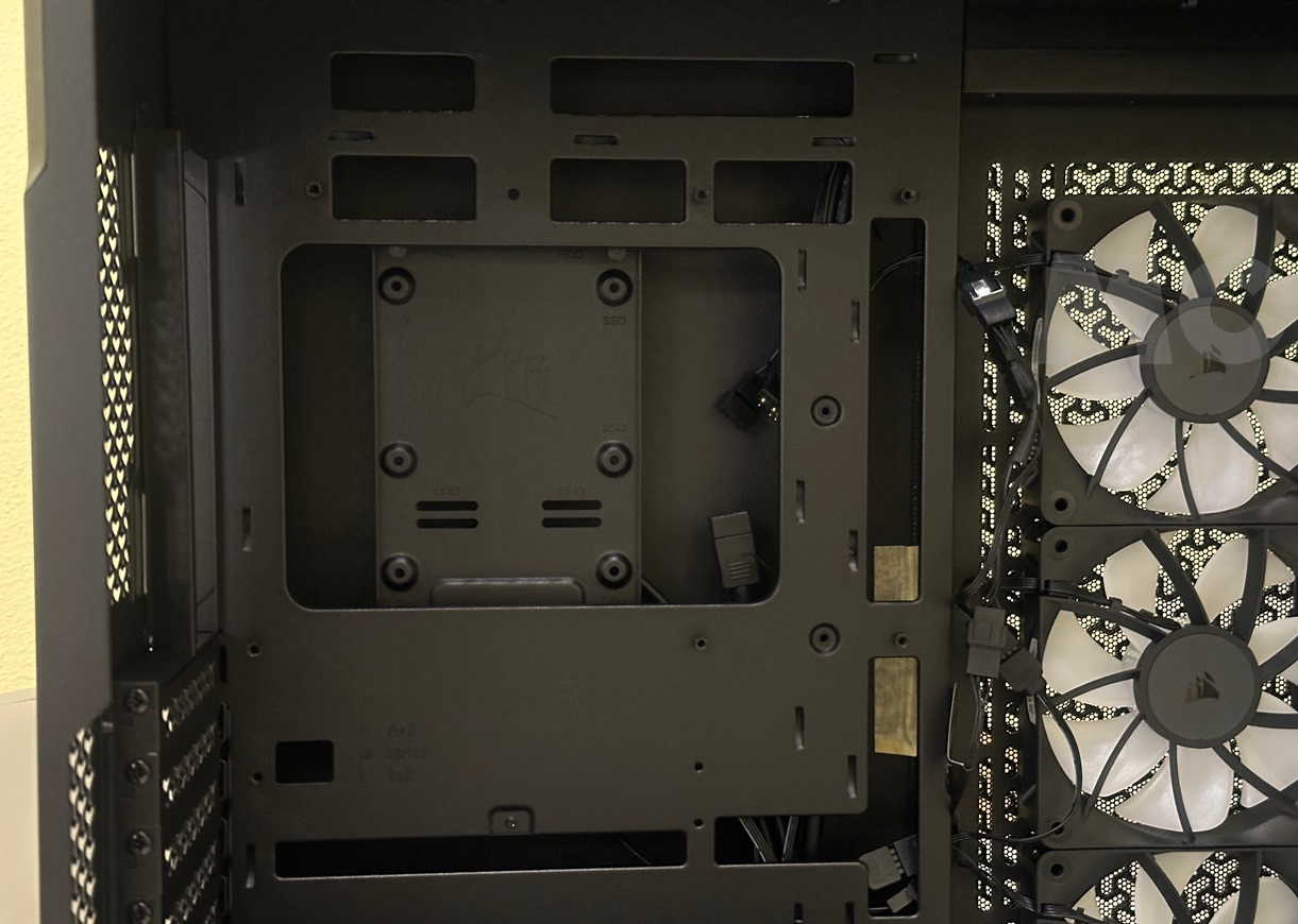 La fuente de alimentación es el siguiente paso. El modelo que he utilizado es semimodular, así que el cable CPU y el cable de 24 pines están instalados de forma permanente. Conecté dos cables PCIe, uno para la gráfica y otro para el concentrador de iCUE que queda invisible en la parte trasera, y un cable de alimentación SATA para la unidad SSD secundaria. Este SSD queda fijado también en la parte trasera, así que no hay problema.