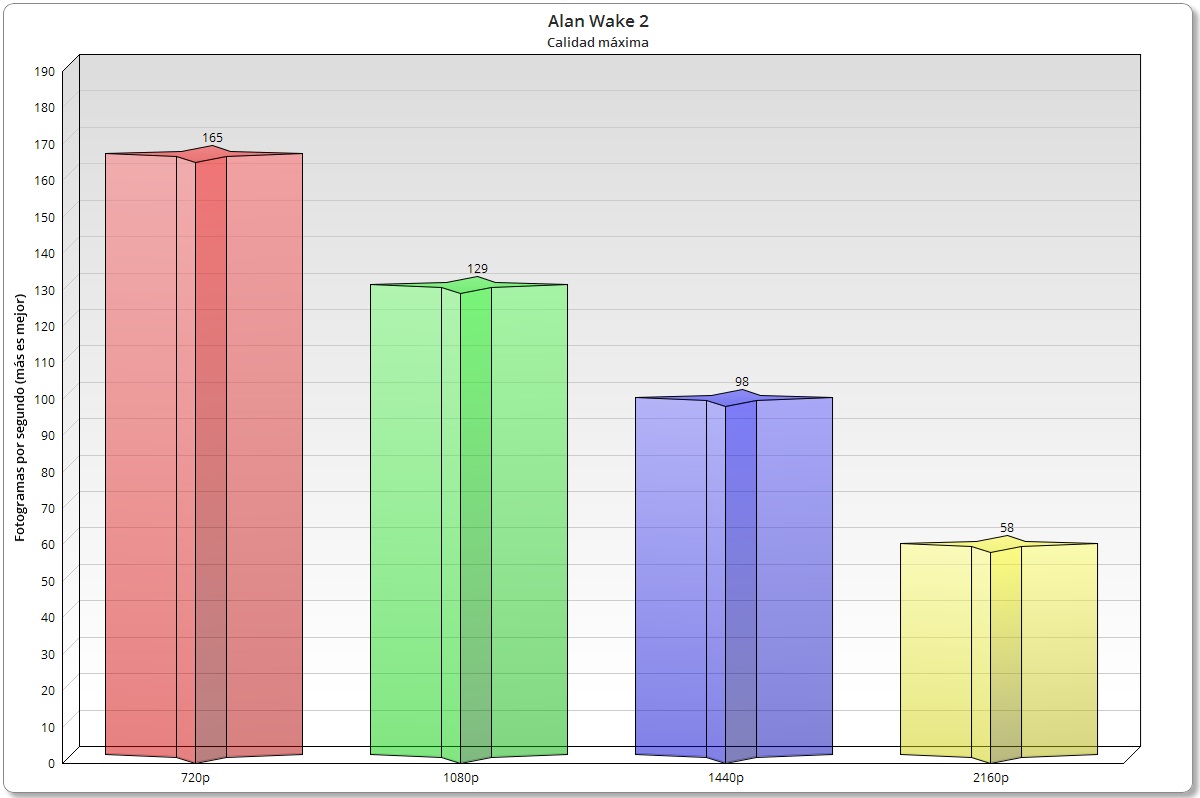 Con Alan Wake 2 no tenemos problemas ni siquiera en 720p, porque es un juego tan exigente y tan dependiente de la GPU que incluso al pasar de 720p a 1080p se produce una pérdida de rendimiento muy importante. En general el Intel Core Ultra 5 245K, el Ryzen 7 9700X y el Intel Core i5-14600K rinden casi igual en este juego como cabía esperar.