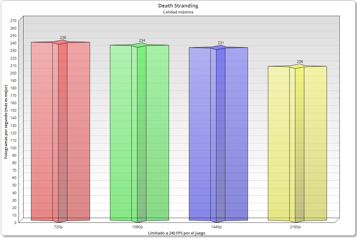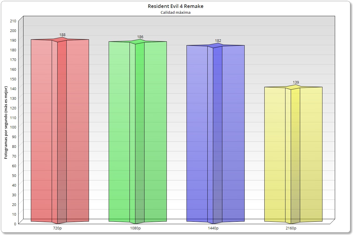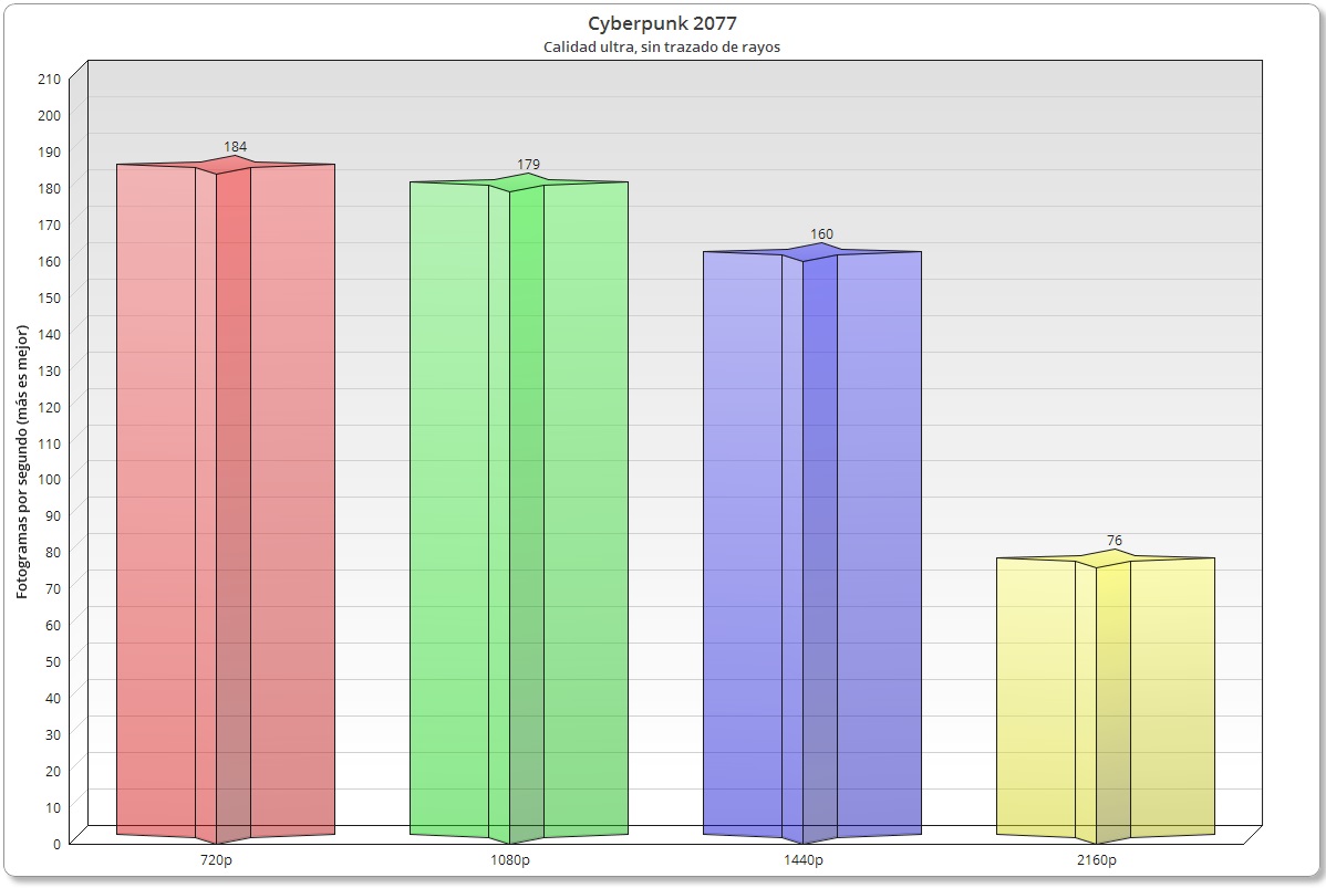 En este análisis he utilizado todos los juegos con calidad ultra o máxima, dependiendo de las particularidades de cada título, con resoluciones 720p, 1080p, 1440p y 2160p. La GeForce RTX 4090 es una tarjeta gráfica muy potente, así que su rendimiento puede verse ligeramente afectado por el procesador incluso en resoluciones donde normalmente no tendríamos variaciones, como 1440p e incluso 2160p.