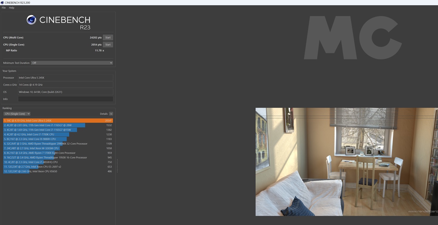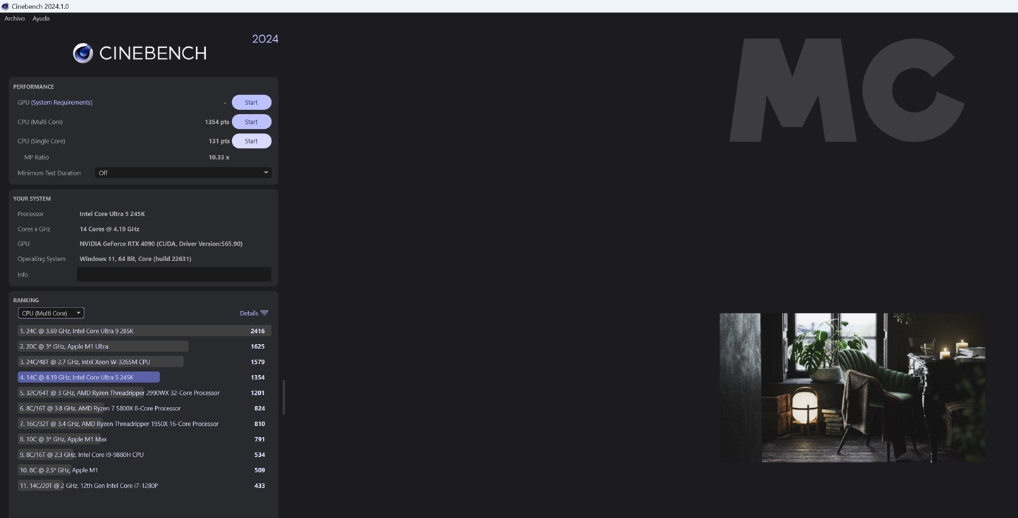 Esta prueba de renderizado es capaz de llevar al límite a cualquier procesador actual. El Intel Core Ultra 5 245K consigue 2.054 puntos en monohilo y 24.202 puntos en multihilo, unas puntuaciones muy buenas que le permiten superar los 2.001 puntos y los 23.551 puntos que consigue el Core i5-14600K en monohilo y multihilo.