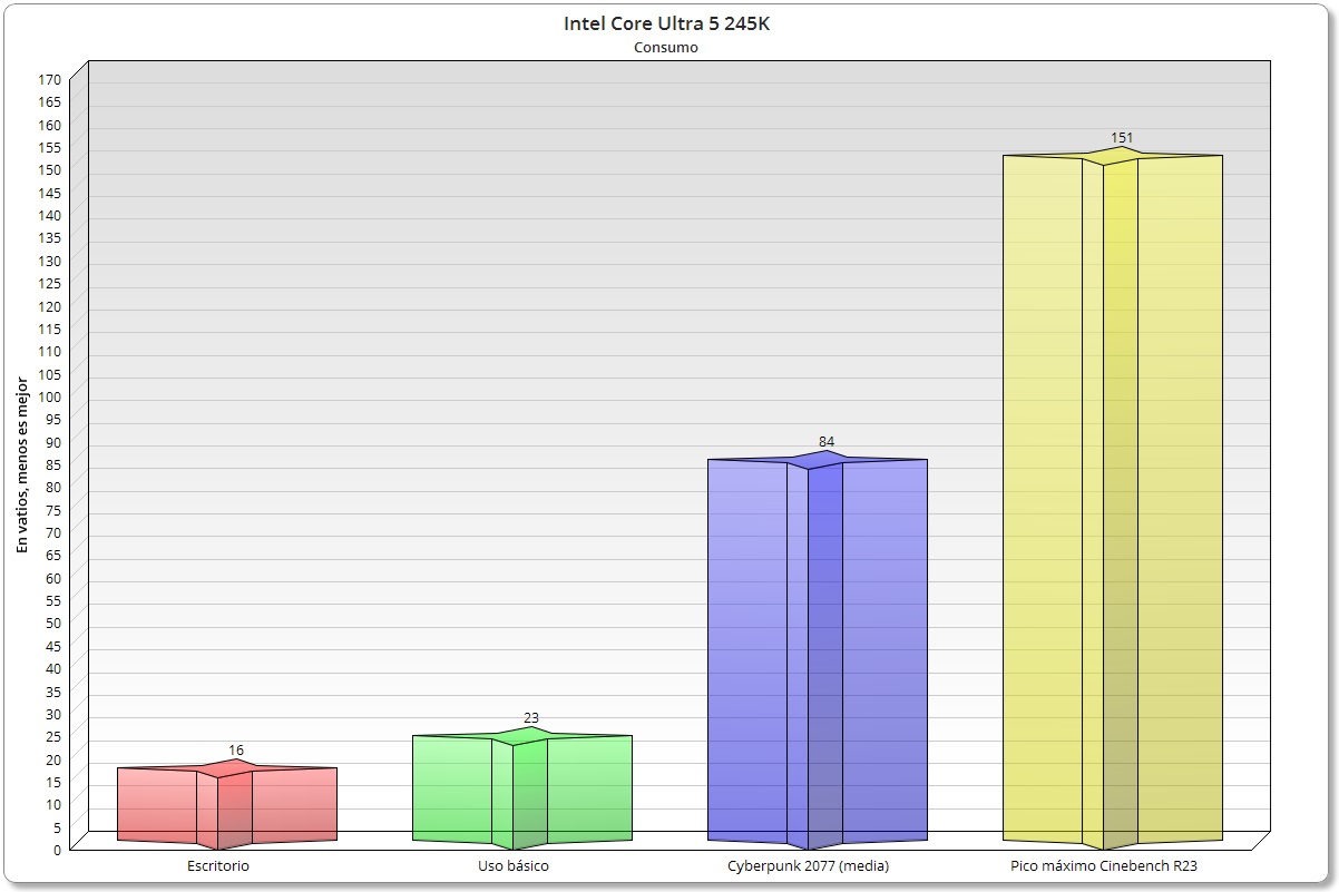 El Intel Core Ultra 5 245K tiene unos valores de consumo muy buenos, ya que son más bajos que los que registra el Intel Core i5-14600K. En Cyberpunk 2077 lo nuevo de Intel consume 33 vatios menos, y en Cinebench R23 consume 39 vatios menos. Si lo comparamos con el Ryzen 7 9700X no sale tan bien parado, porque este registra un consumo máximo de 88 vatios con la configuración de stock.