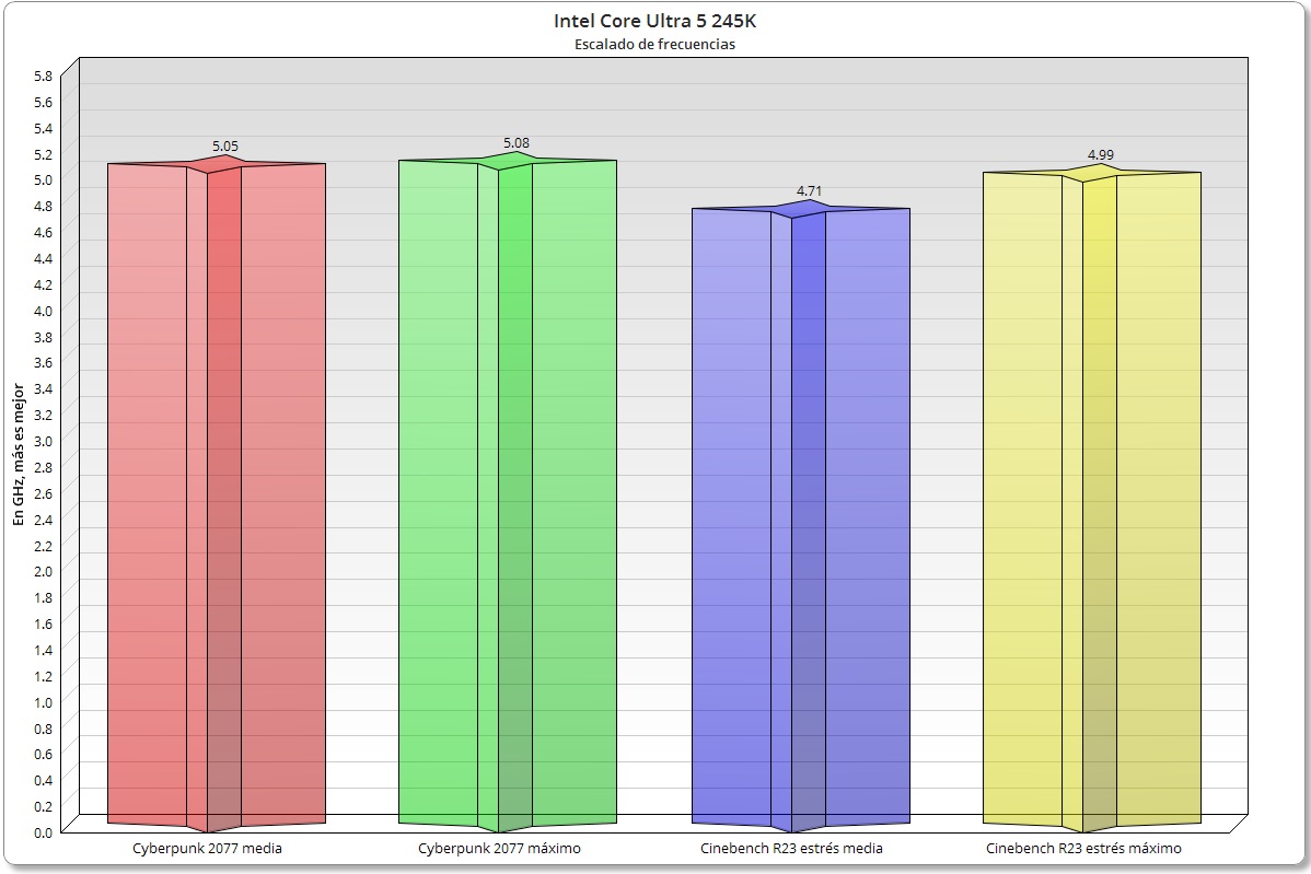 El escalado de frecuencias entra dentro de lo que cabía esperar tras ver cómo se ha comportado el Intel Core Ultra 5 245K en 3DMark CPU. Tenemos unas frecuencias muy estables que se mueven casi siempre en la franja de los 5 GHz, un nivel que es el que indica Intel en las especificaciones para cargas de trabajo que utilicen más de dos núcleos.