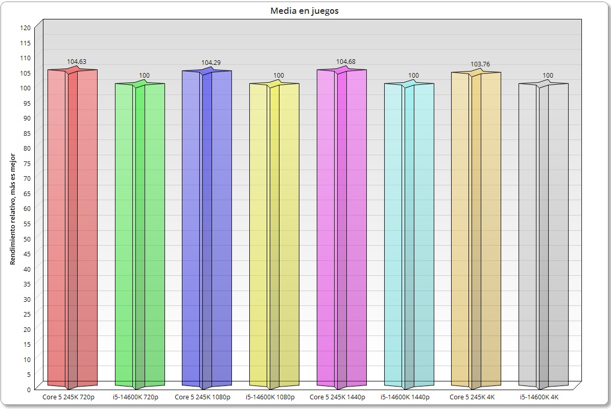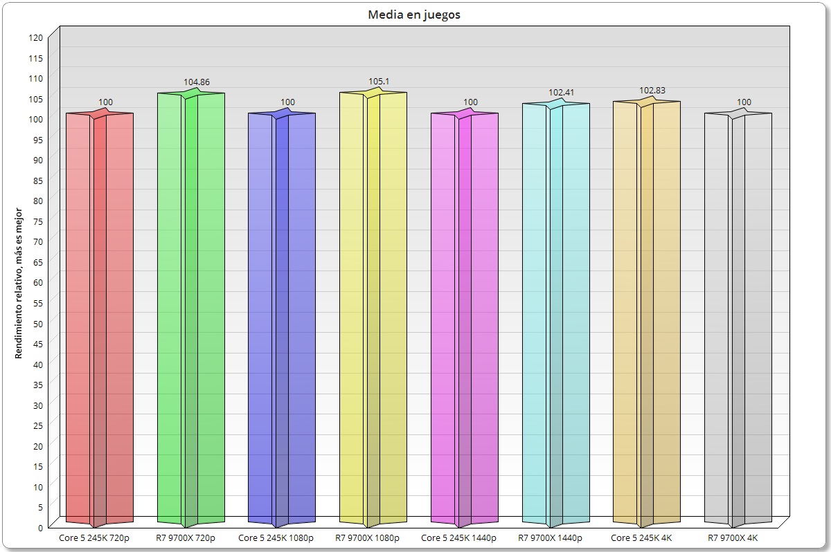 Haciendo una valoración media, el Intel Core Ultra 5 245K ofrece un rendimiento comparable o ligeramente superior, según cada juego en concreto, al Intel Core i5-14600K, aunque pierde en la mayoría de los casos frente al Ryzen 7 9700X, que consigue mejores resultados en casi todos los juegos, y en casi todas las resoluciones.