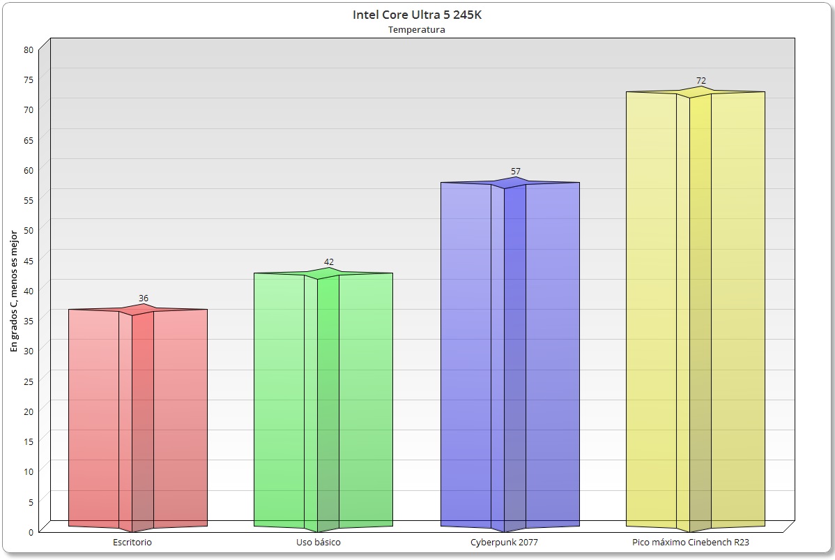 Las temperaturas de trabajo también han mejorado con respecto al Intel Core i5-14600K, y en este caso el Intel Core Ultra 5 245K sí que supera al Ryzen 7 9700X en juegos, pero no en pruebas de carga máxima, como Cinebench R23, donde la CPU de AMD registra 70 grados C de máxima. Logra reducir la temperatura máxima hasta en 12 grados frente al Intel Core i5-14600K en Cinebench R23.