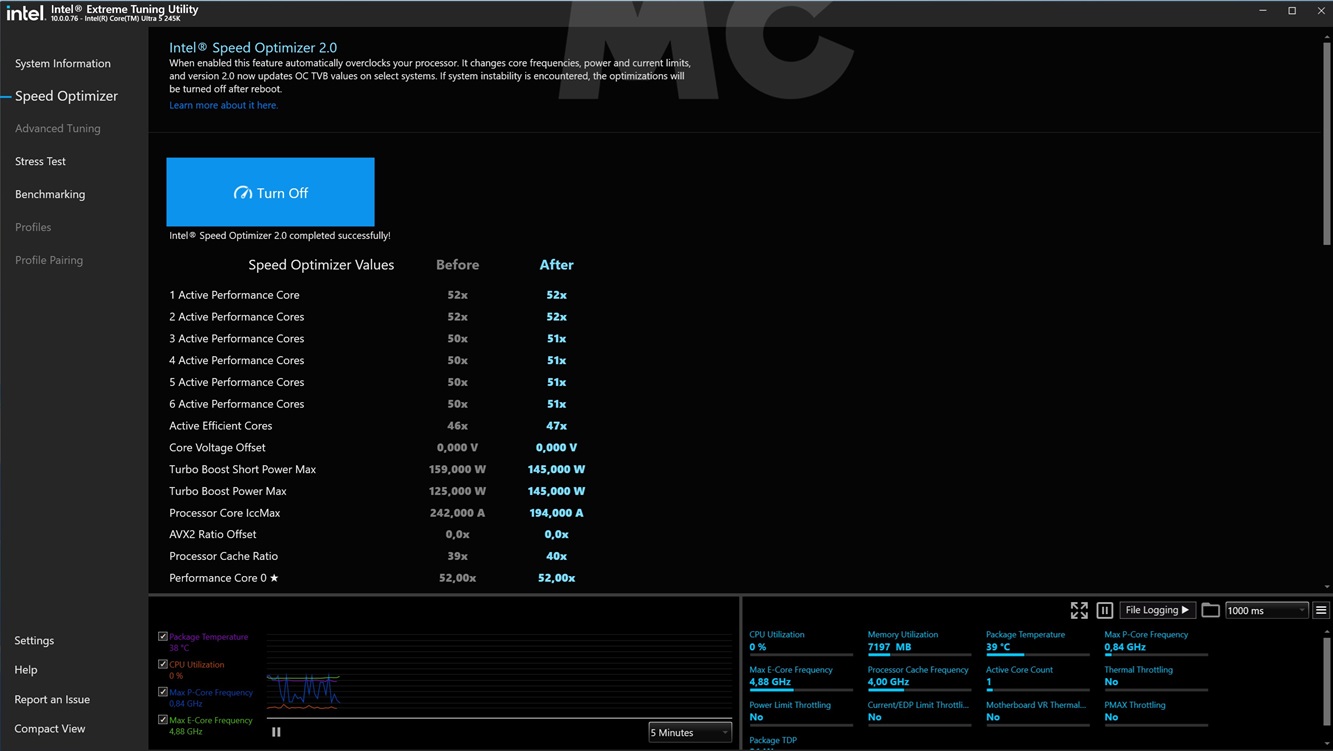 Durante el primer arranque del equipo entré en la BIOS para revisar la configuración, y pude comprobar que esta activa automáticamente el perfil de rendimiento con los ajustes por defecto de Intel. Este fue el perfil utilizado en el análisis, el mismo que empleé con el Intel Core Ultra 9 285K. Con el perfil de rendimiento extremo podríamos conseguir más rendimiento, pero a costa de un mayor consumo y de unas temperaturas de trabajo más altas.