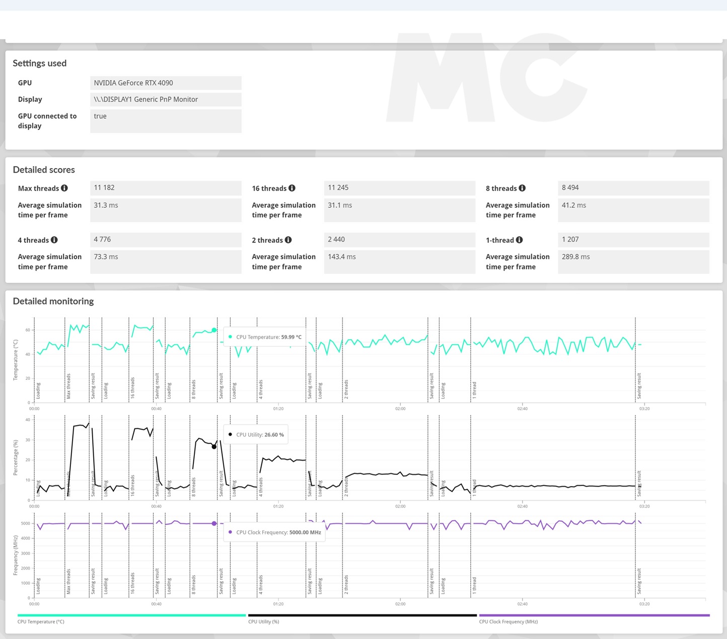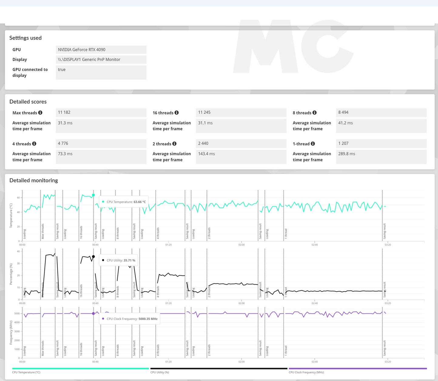 • Con dieciséis hilos no hay cambios en la velocidad, que sigue siendo de 5.000 MHz, y la temperatura llega a los 63,66 grados C.