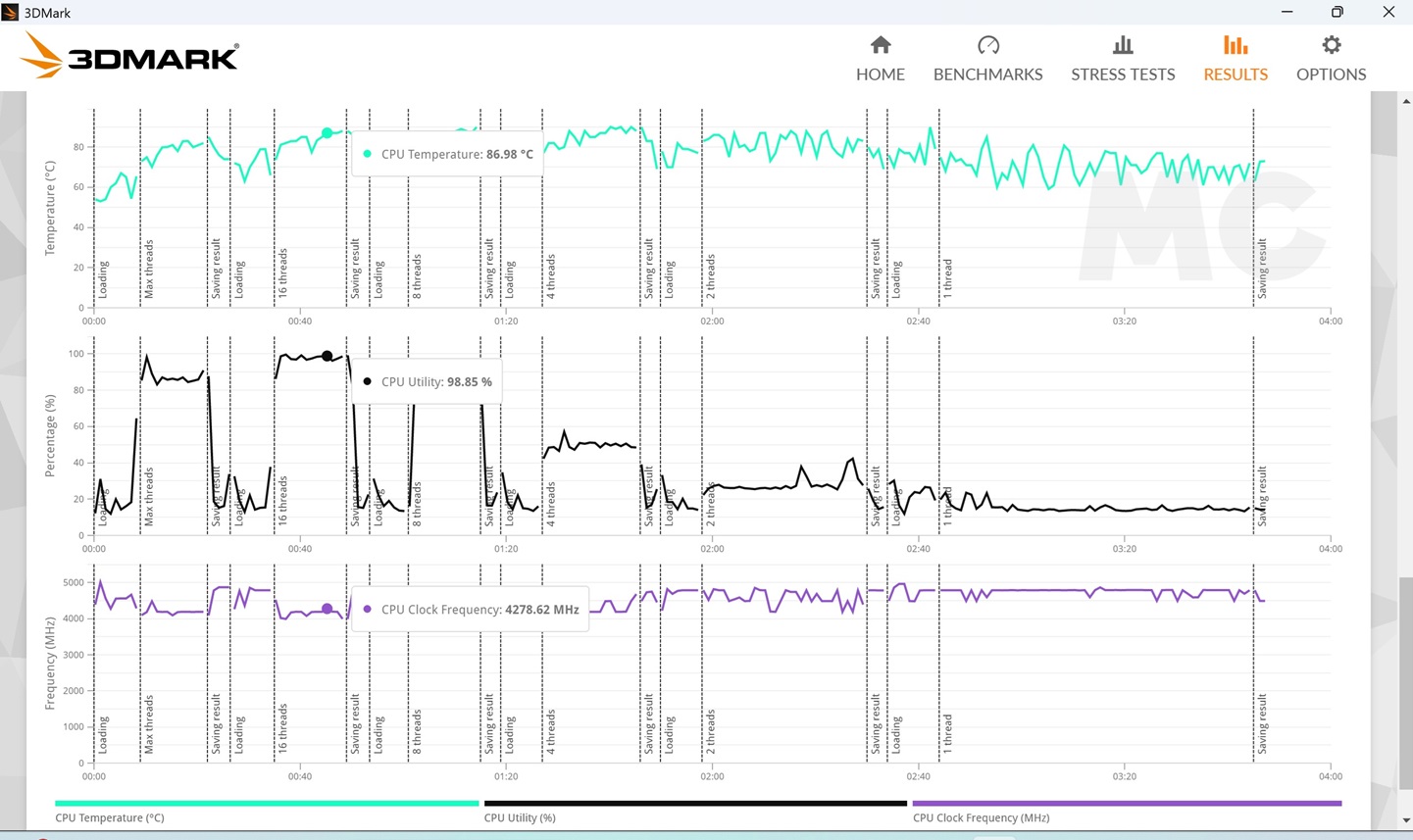 - Con 16 hilos activos en realidad seguimos en el máximo de 8 hilos que puede paralelizar este procesador, por eso los resultados y las puntuaciones son casi idénticos, porque no puede ir más allá de 8 hilos. En este caso la velocidad media más estable es de 4.278 MHz, y la temperatura máxima de 86,98 grados C.