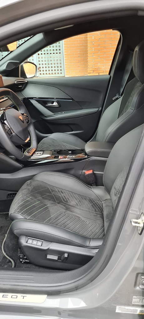 En lo que respecta al interior este 208 de nueva generación conserva esa sensación de buenos materiales y acabados cuidados que caracterizan en general a los modelos de la marca, que alcanza incluso a los más compactos. En este caso la versión GT incorpora el uso de tapicería Alcántara en los asientos con pespuntes verdes y grises que también encontramos en el volante. Los asientos son cómodos y con un diseño que aunque no es deportivo sujeta bastante bien en curva y permiten viajes largos. El del conductor además dispone de reglaje eléctrico con función de masaje y ajuste lumbrar.