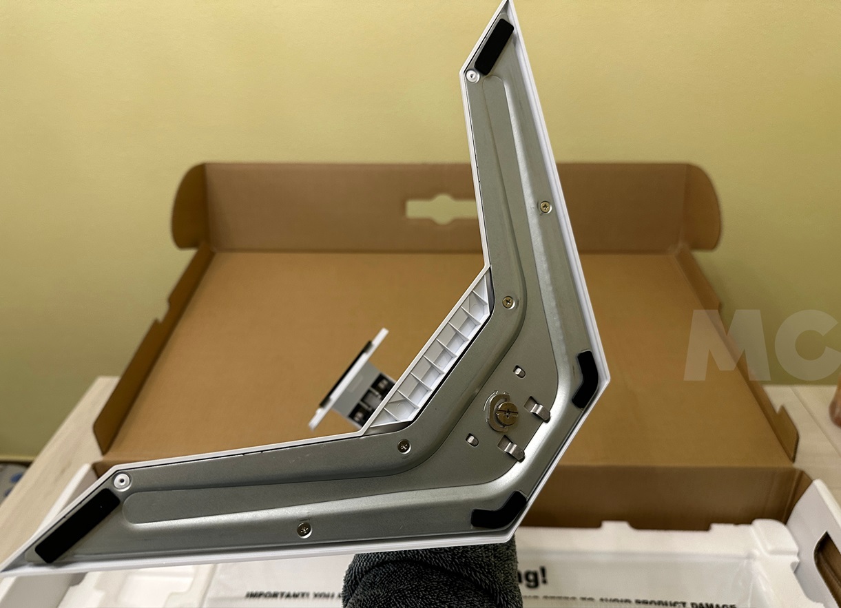 La pantalla viene boca abajo en la caja. Esto permite una mejor protección, y facilita el montaje del brazo. No saquéis la pantalla, introducid las pestañas fijas del brazo en la parte trasera dejando la pantalla en la caja tal cual viene, y una vez que estas hayan encajado pulsad para retraer las pestañas móviles e introducid por completo el rectángulo del brazo de apoyo. Soltad para que las pestañas móviles se extiendan y se agarren y listo.