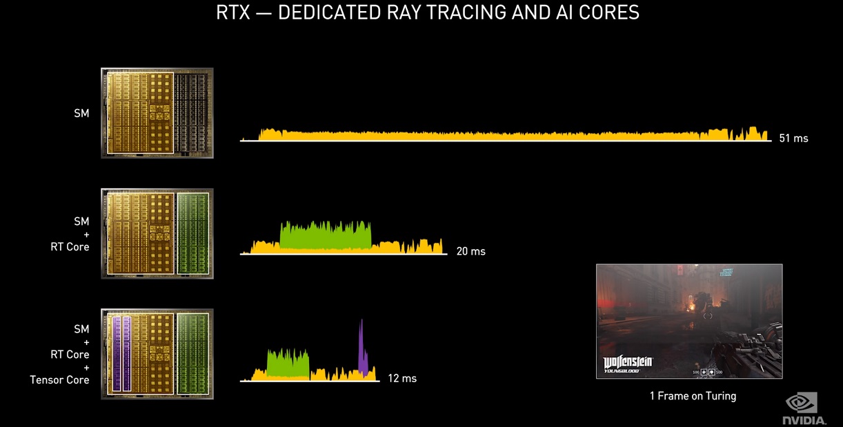 Esta tecnología se acelera en los núcleos tensor, pero no debemos pensar por ello que no tiene ningún coste a nivel de rendimiento. DLSS Super Resolution consume un determinado tiempo de renderizado, pero al reducir la carga gráfica utilizando una menor cantidad de píxeles lo compensa mejorando el rendimiento final.