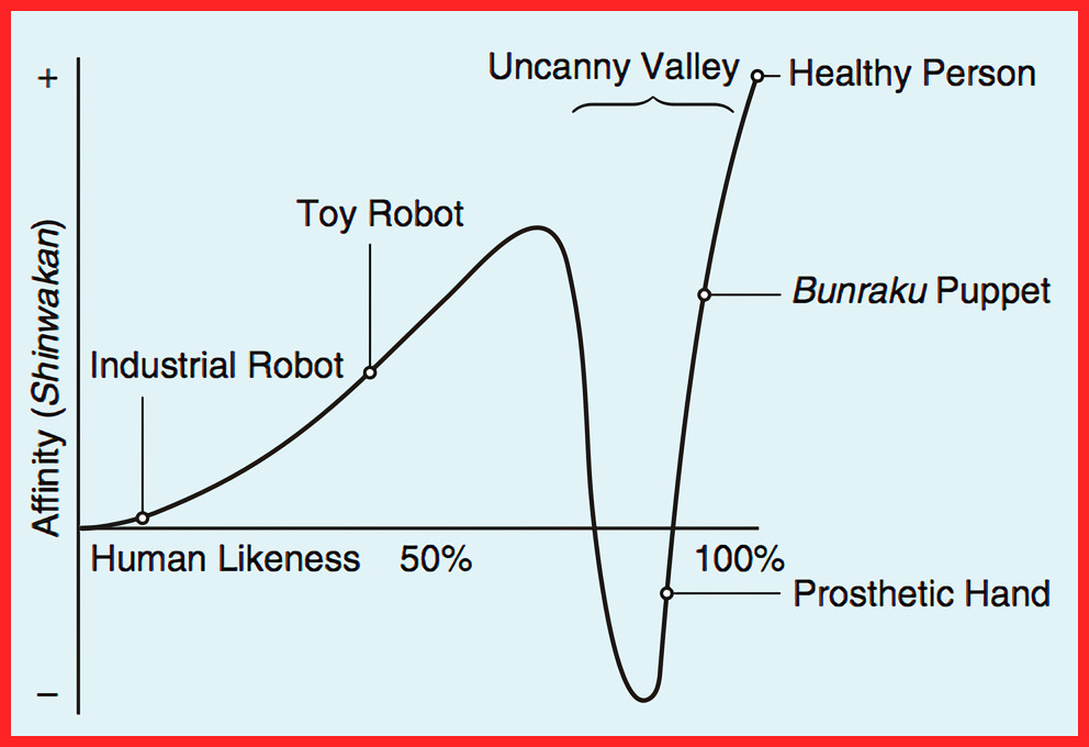 Mori observó que, a medida que los robots y androides se volvían más realistas, la reacción de las personas hacia ellos mejoraba. Sin embargo, cuando esos robots alcanzaban un nivel de realismo «casi humano» pero no perfecto, algo extraño sucedía: en lugar de fascinación, provocaban incomodidad, rechazo o incluso miedo. Representó este fenómeno con una curva, donde el aumento del realismo conducía a una mejora en la aceptación… hasta que caía bruscamente en un «valle» de reacciones negativas, el «valle inquietante». Si el realismo seguía aumentando y lograba ser indistinguible de un humano real, la curva volvía a subir.