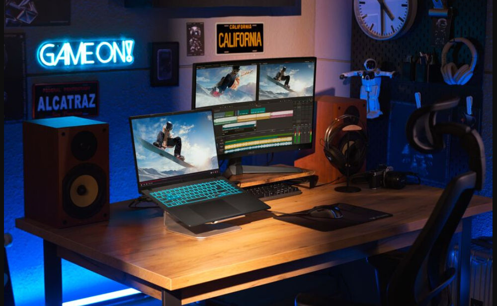 Está equipado con un procesador Intel Core 7 Ultra y una gráfica dedicada NVIDIA GeForce RTX 4050. Monta un sistema de enfriamiento con ventiladores duales y tubos de calor que prometen entregar un rendimiento constante, mientras que la memoria rápida (hasta 32 GB de DDR5 de 5600 MHz en ranuras de memoria dual) y las unidades de estado sólido PCIe Gen4 reducen los tiempos de carga.