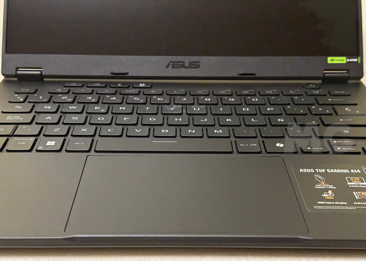 ASUS ha hecho un buen trabajo con la pantalla del TUF GAMING A14, pero el teclado no se queda atrás. Como os dije en el análisis externo es uno de los mejores de su clase por su buen tacto, su ergonomía y su excelente respuesta. En este sentido el recorrido de 1,7 mm por pulsación es clave, ya que mejora la experiencia al escribir y nos permite pulsar con rapidez cometiendo menos fallos, lo que equivale a ser más productivos.