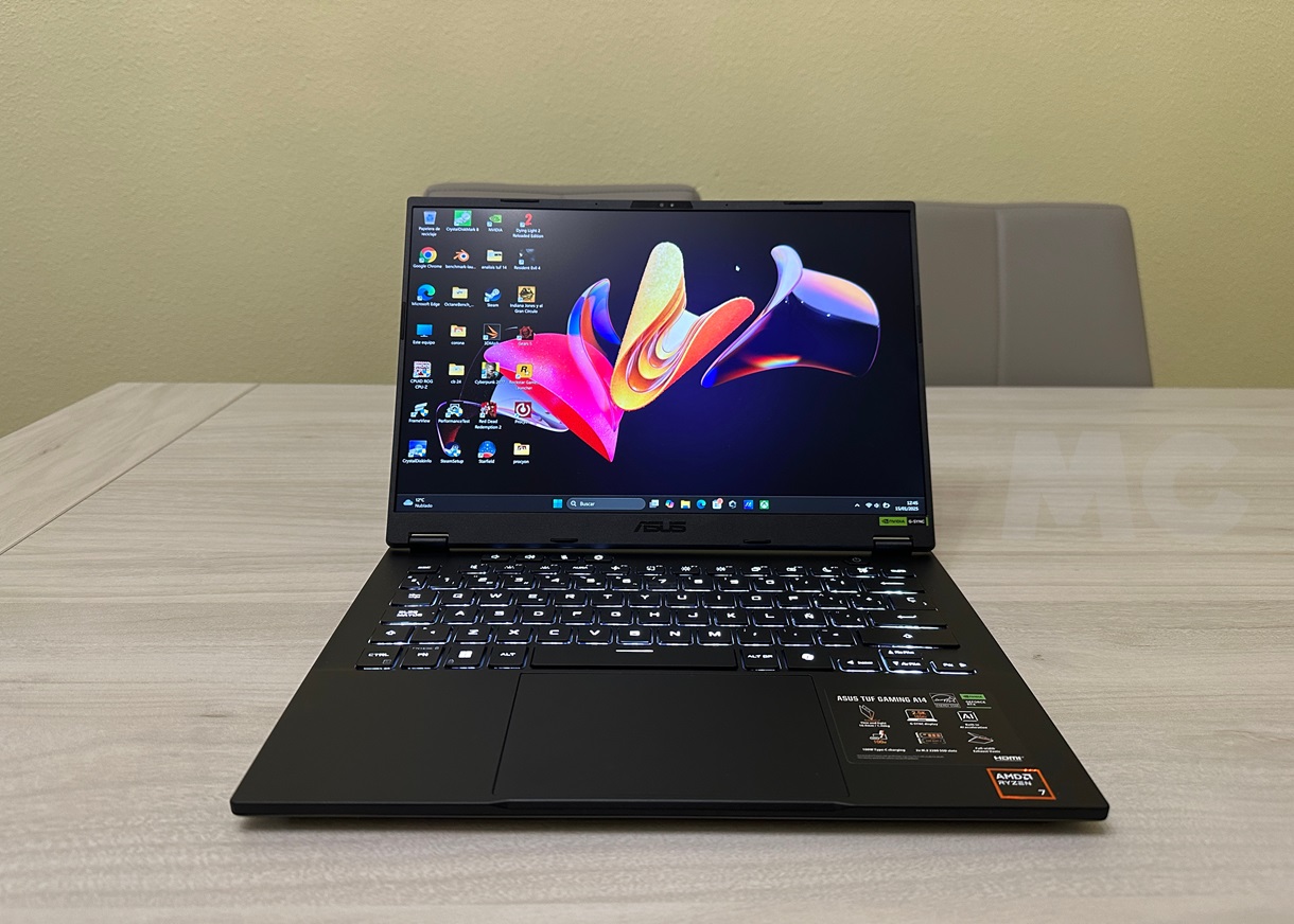 El ASUS TUF Gaming A14 es un portátil muy compacto y muy ligero que, sin embargo, hace gala de una configuración equilibrada. Su CPU y GPU son capaces de ofrecer un buen rendimiento incluso en juegos y aplicaciones exigentes, y sus 32 GB de memoria RAM son toda una garantía de vida útil. No es ampliable, pero cambiaremos de portátil antes de que se nos queden cortos.