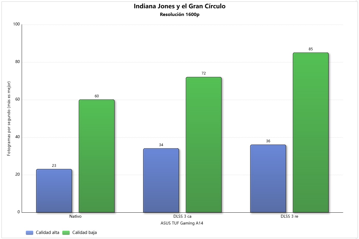 Todos los juegos que hemos probado funcionaron realmente bien en el ASUS TUF Gaming A14. Incluso los más exigentes, como Starfield y Cyberpunk 2077, se mueven de forma fluida incluso en calidad máxima. Solo tendremos que bajar calidad en Indiana Jones y el Gran Círculo por una cuestión de falta de memoria gráfica.